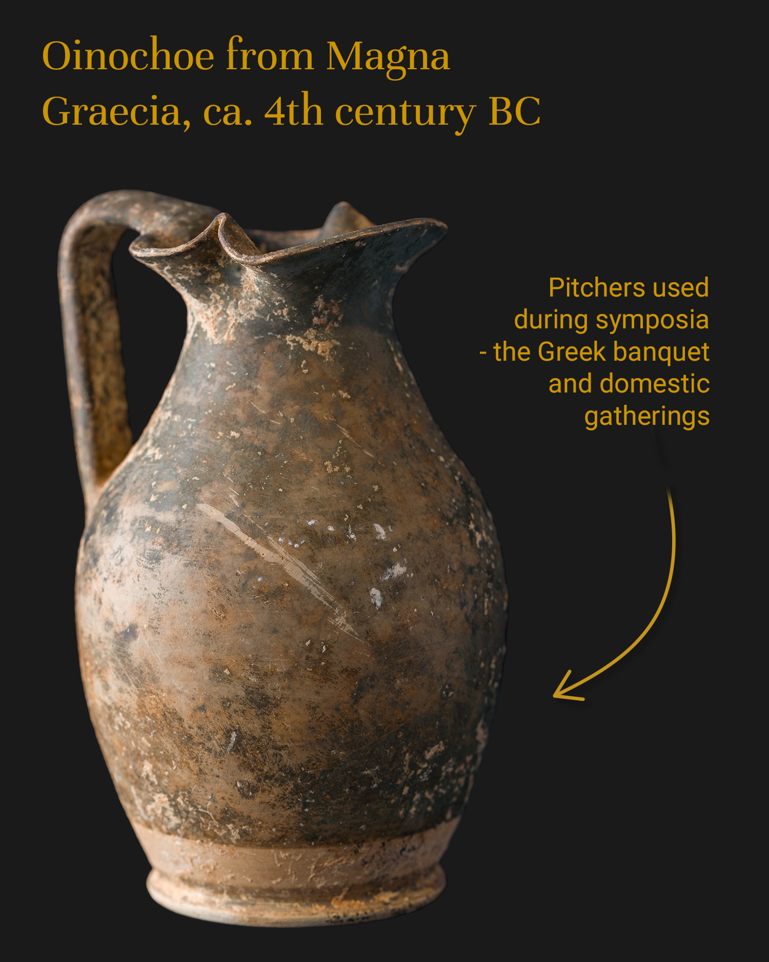 A ceramic vessel, turned on a wheel, used in antiquity as a basic pitcher at Greek feasts (symposion). Oinochoe presents a variant typical of the Greater Greece region with a three-leaf spout, whose innovative form facilitated precise portioning of liquid without spilling.