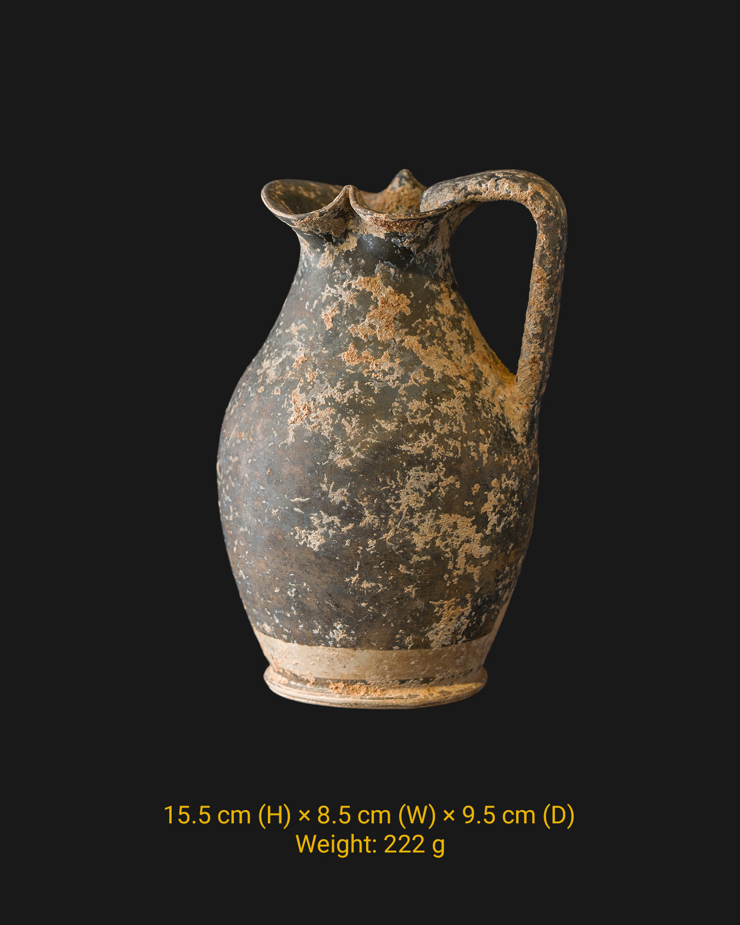 Dark gray/dark brown matte surface with visible mineral deposits and earth deposits. The state of preservation is very good, the handle and spout are complete, which increases the collector and research value. This is a rare utilitarian piece, representing a tangible piece of ancient Italian culture.