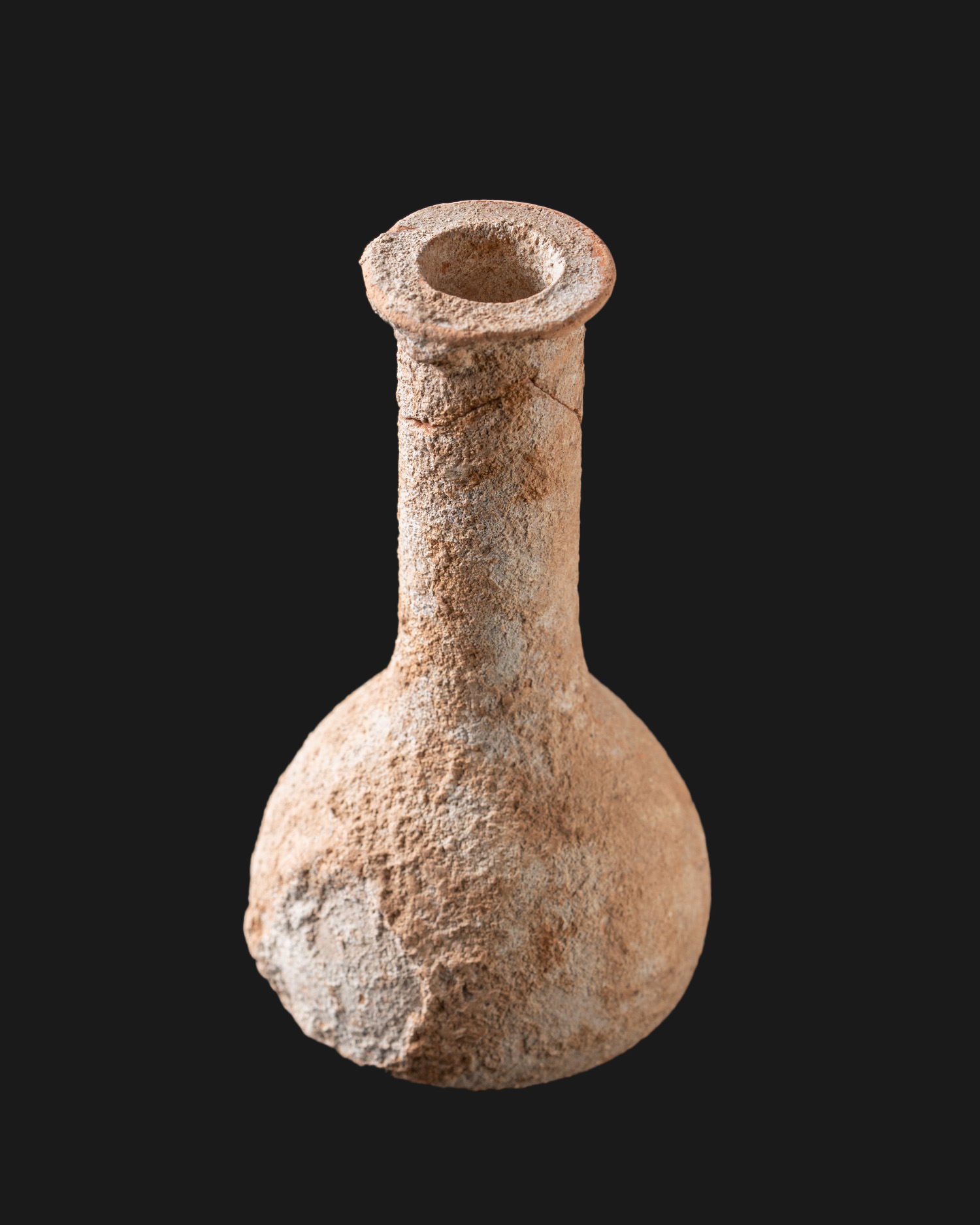Authentic Roman balsamarium (unguentarium) from the 1st-2nd century BC, made of clay using a potter’s wheel. The vessel, which had a distinctive form – with a cracked belly, slender neck and wide, orifice-shaped spout, was used to store liquid fragrances and toilet scents. It was often part of the equipment of the deceased. Formerly it was believed that balsamaria were used to collect the tears of mourners during funeral ceremonies – hence the misnomer lacrimatorium (from lacrima – tear).