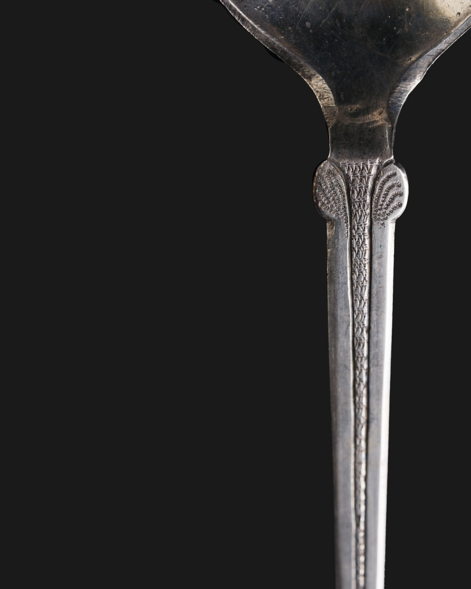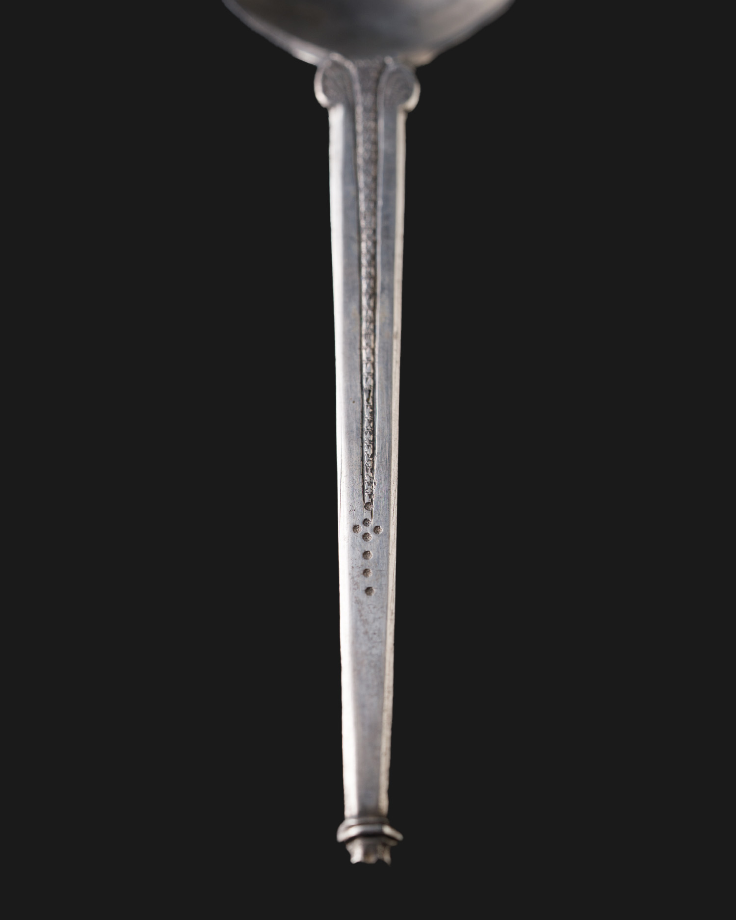 The handle is in the shape of a flat faceted bar, engraved, and on the underside of the scoop an engraved cartouche of the coat of arms with a blank shield. The lack of a coat of arms probably means that the spoon never reached a noble recipient, or that its owner was a non-heraldic person, such as a burgher.