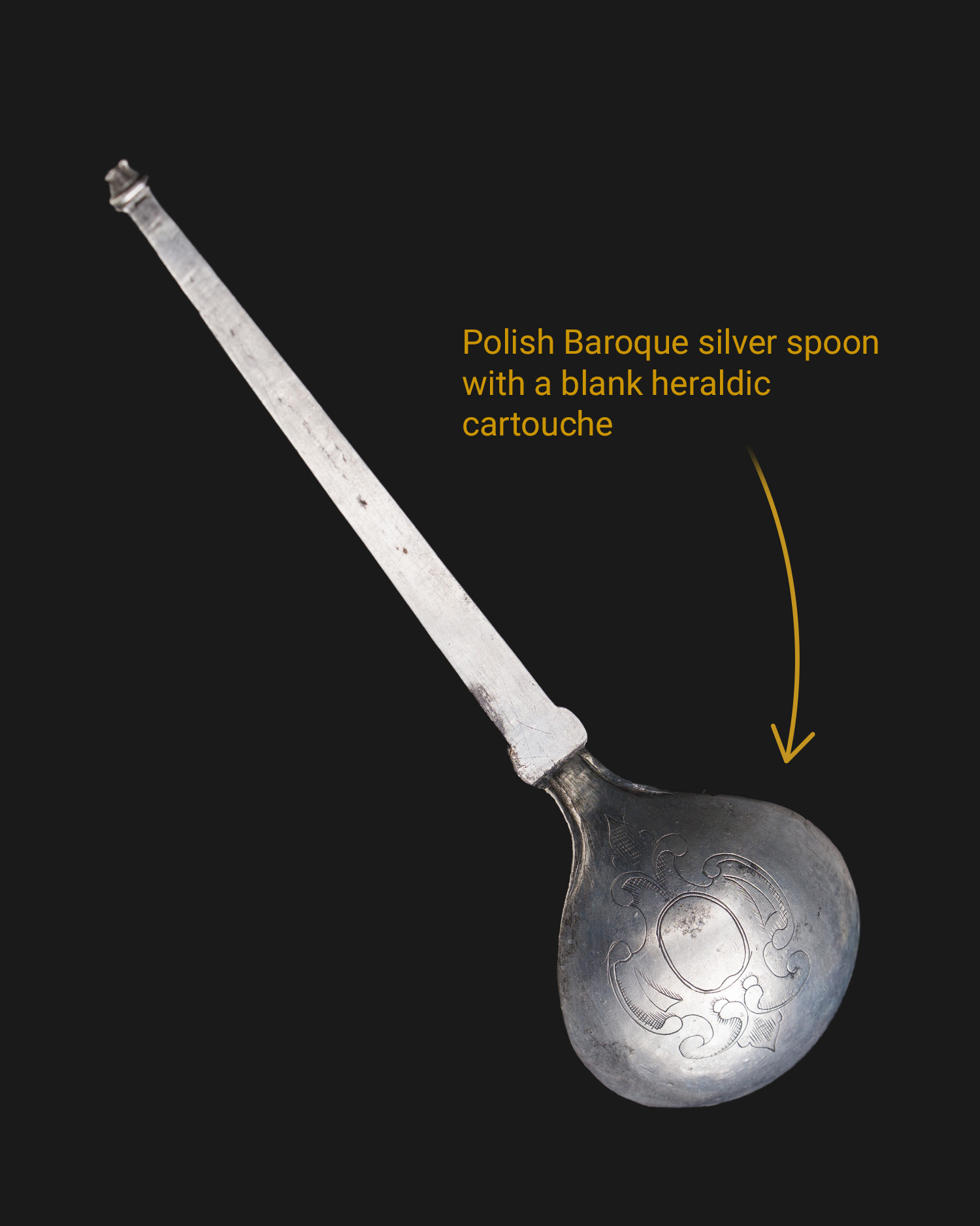Original, Polish spoons from the 17th century very rarely appear on the collector's market. The vast majority of such silverware is in museum collections, including those at Wawel Castle and the National Museum in Cracow. A rarity is the absence of the coat of arms in the decorative cartouche on the bottom of the scoop, prepared for it. This is an indication that it was not the spoons that were made to order, but the final piece of decoration, which was the coat of arms placed in the shield prepared in advance.