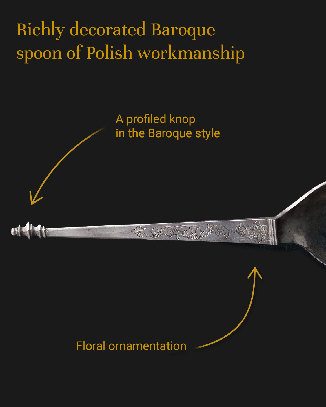 The rich floral motif engraved on the handle of the spoon is not just decorative. In the Baroque era, it was a symbol of refined taste, wealth and membership in the urban elite. Such spoons may have belonged to wealthy burghers, clergy or guild members.