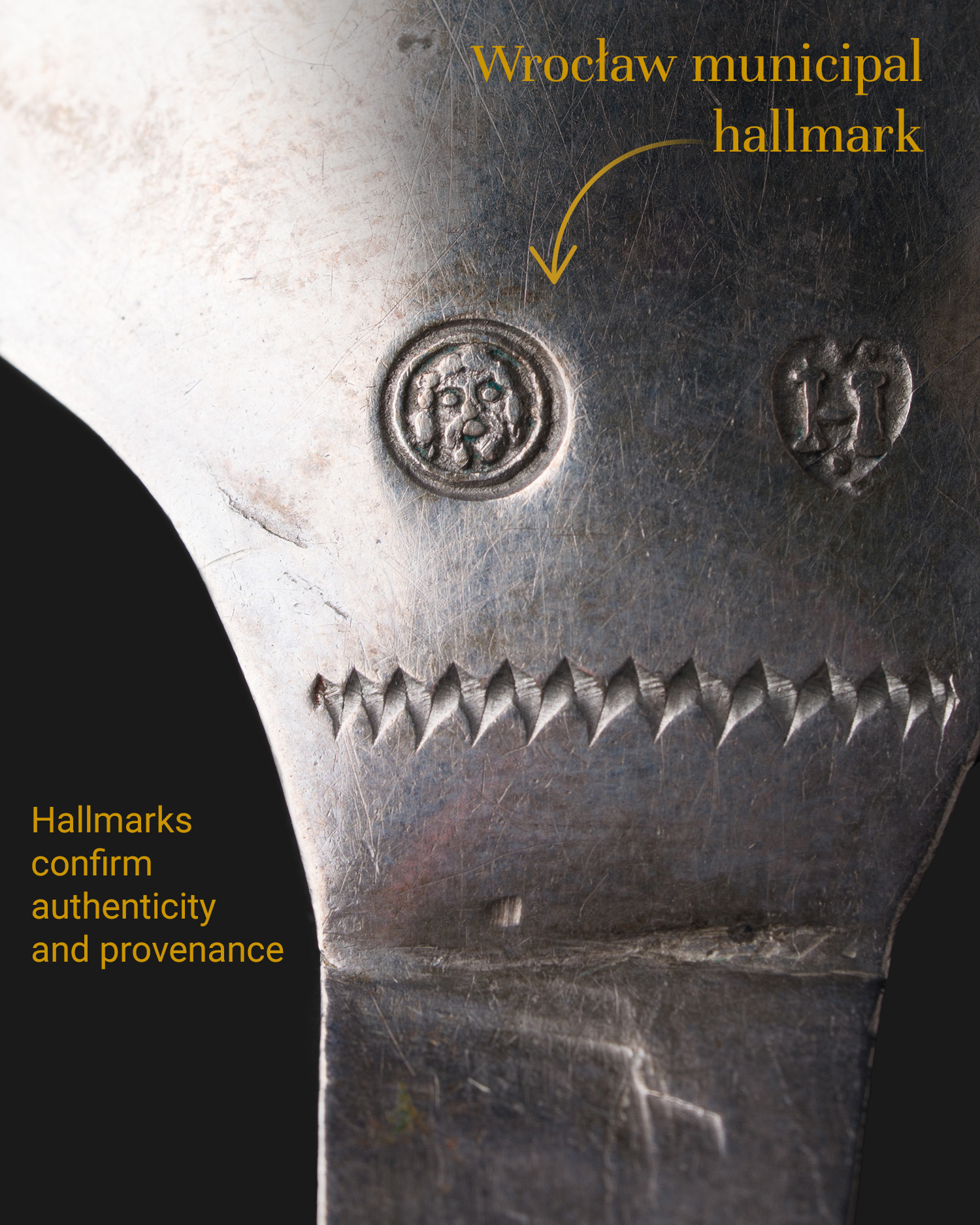 The proboscis, visible where the shank joins the picker, was a distinctive mark of Lower Silesian proboscises - rarely seen outside the Silesian region. Today, it is a unique identifying feature for regional silver.
