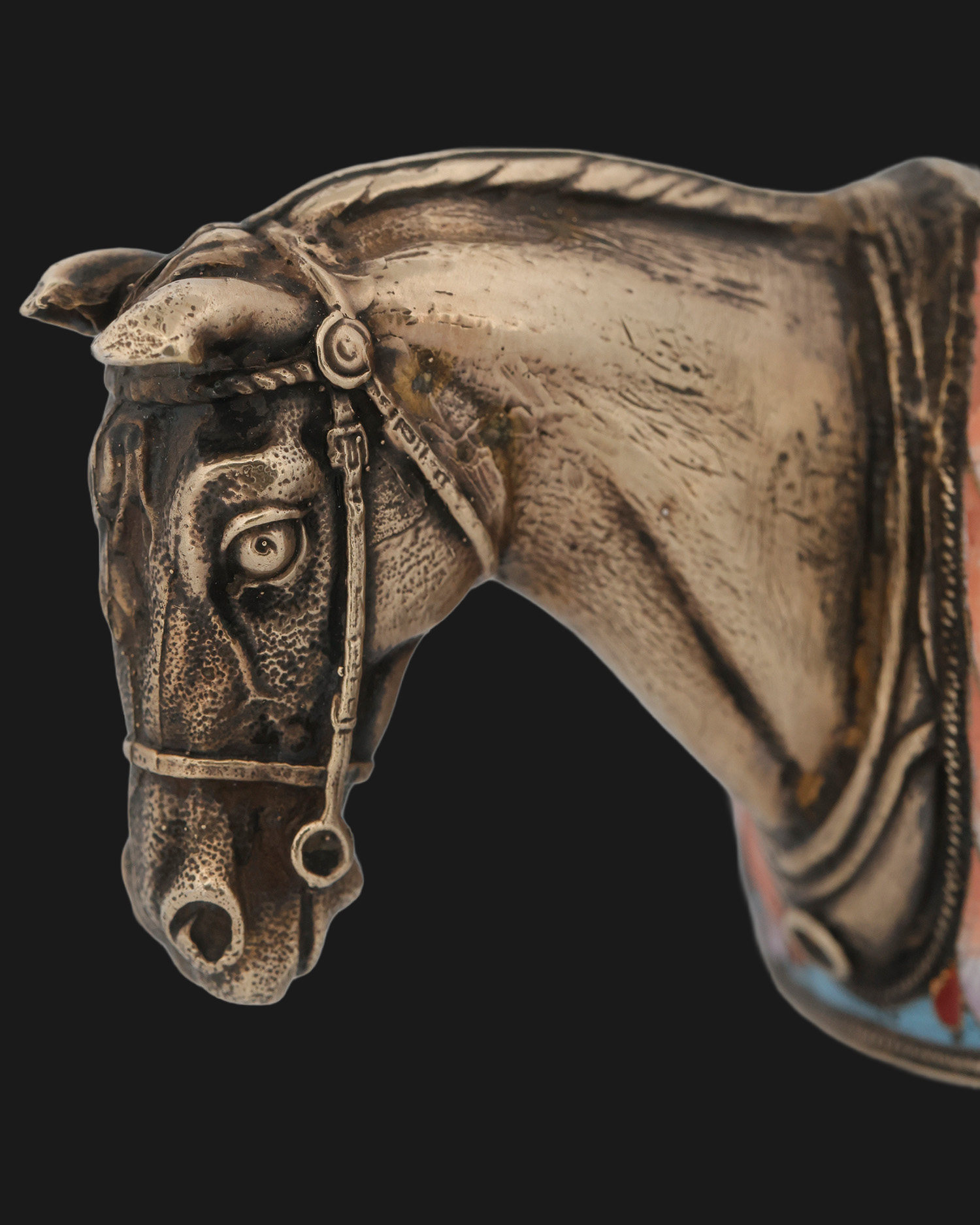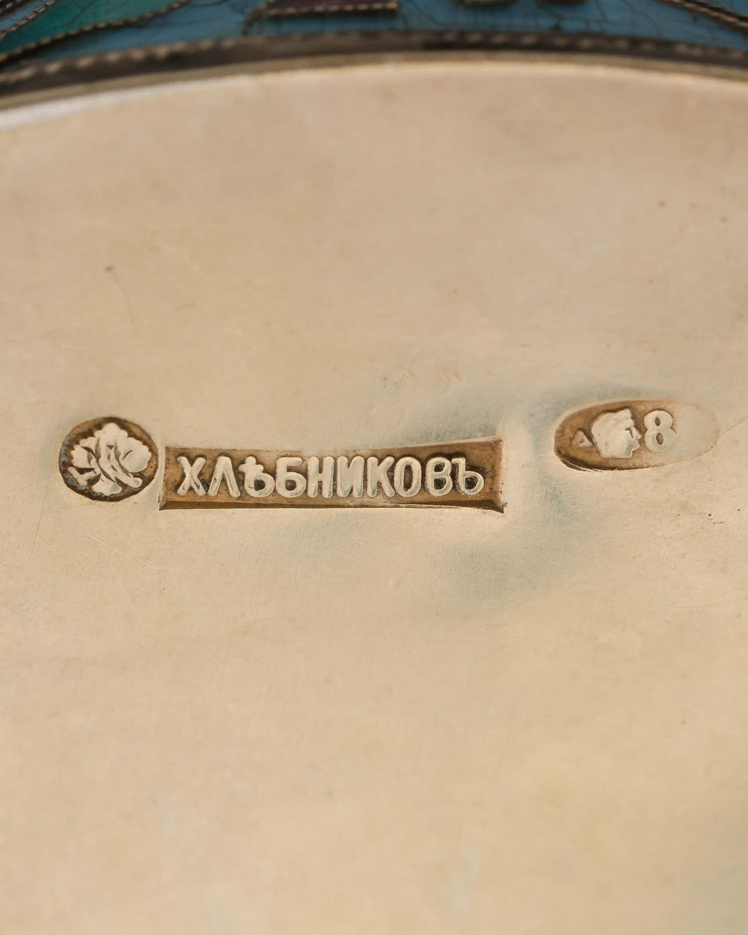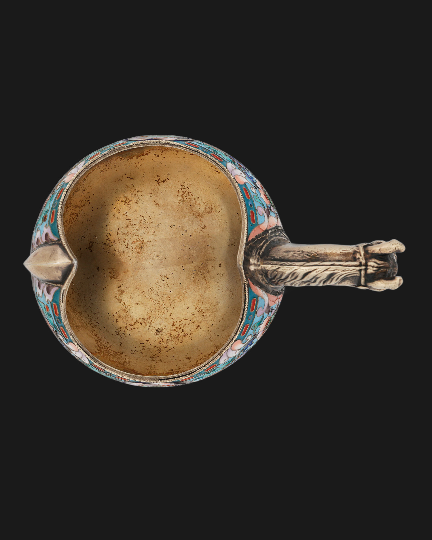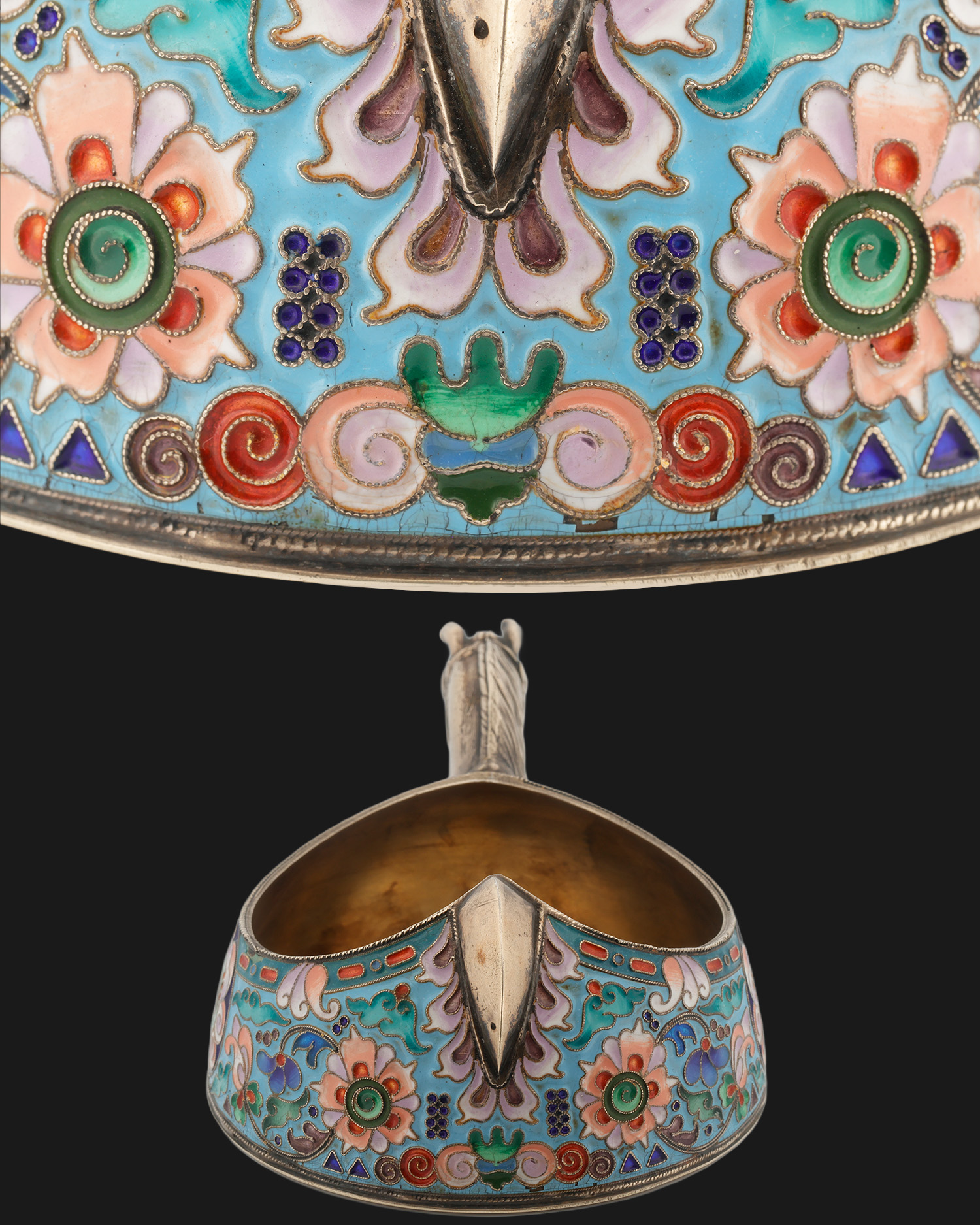 A unique kovsh from the famous Moscow factory of Ivan Khlebnikov, made of silver and maintained in the aesthetics of the Novorussian style. The surface of the vessel is decorated with enamel cloisonné – cells formed from thin silver wires soldered to the body, forming partitions later filled with colored glaze, repeatedly fired and polished. The result is a smooth, glossy decoration with floral and geometric motifs in vivid colors. A striking accent is the naturalistically chiseled silver horse’s head forming the vessel’s handle. The interior retains traces of the original gilding. The kovsh bears the punches: the inscription ХЛѢБНИКОВЪ, which is the signature of Ivan Khlebnikov’s company with an eagle (marking the Imperial Court’s suppliers), and the oval Moscow probationary mark – the profile of a woman in a coquina with the Greek letter delta and the number 84 (partially rubbed off), indicating the sample of silver.