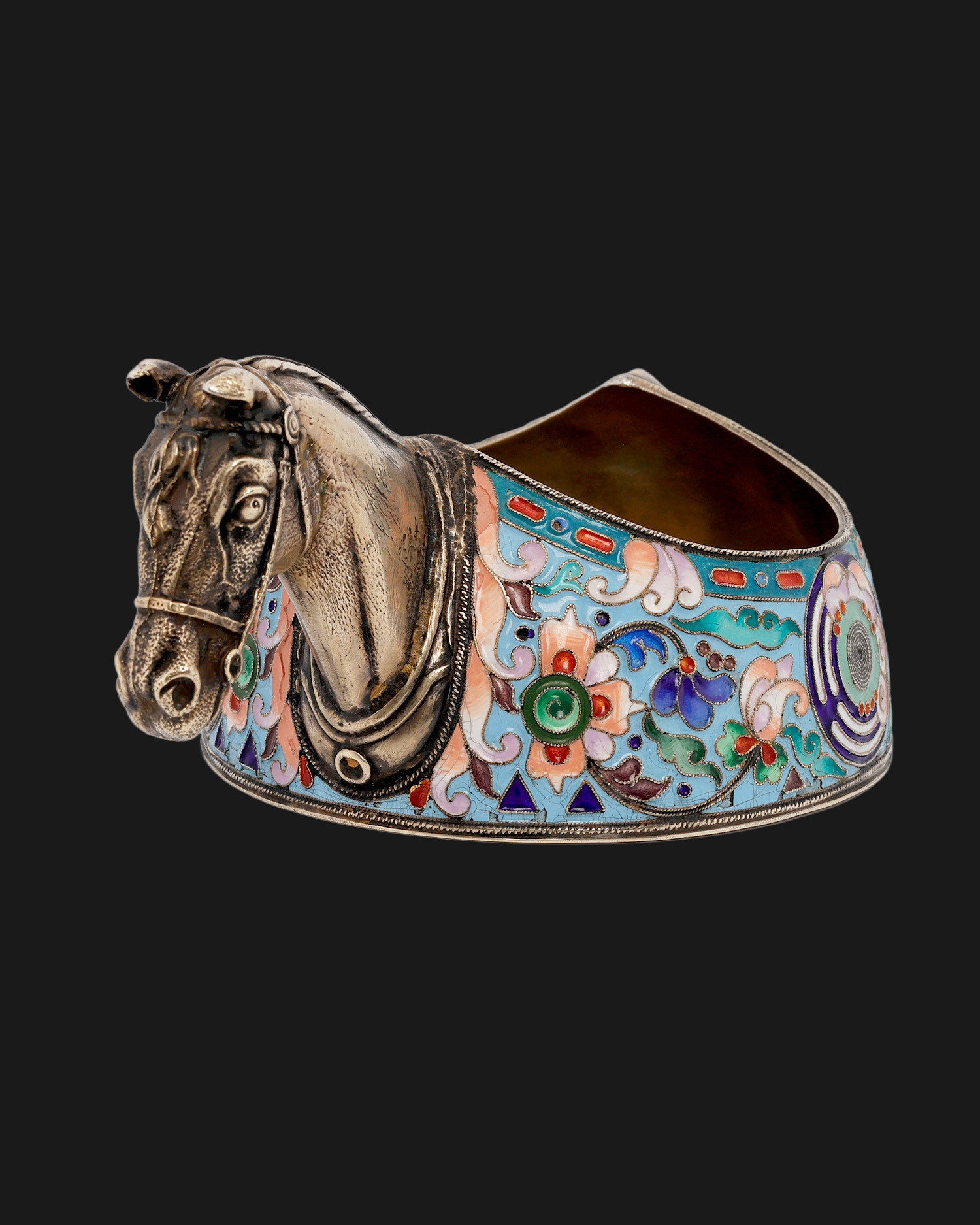 Ivan Khlebnikov, Kovsh with horse’s head, silver, enamel, gilt, Moscow, 1860-1918
