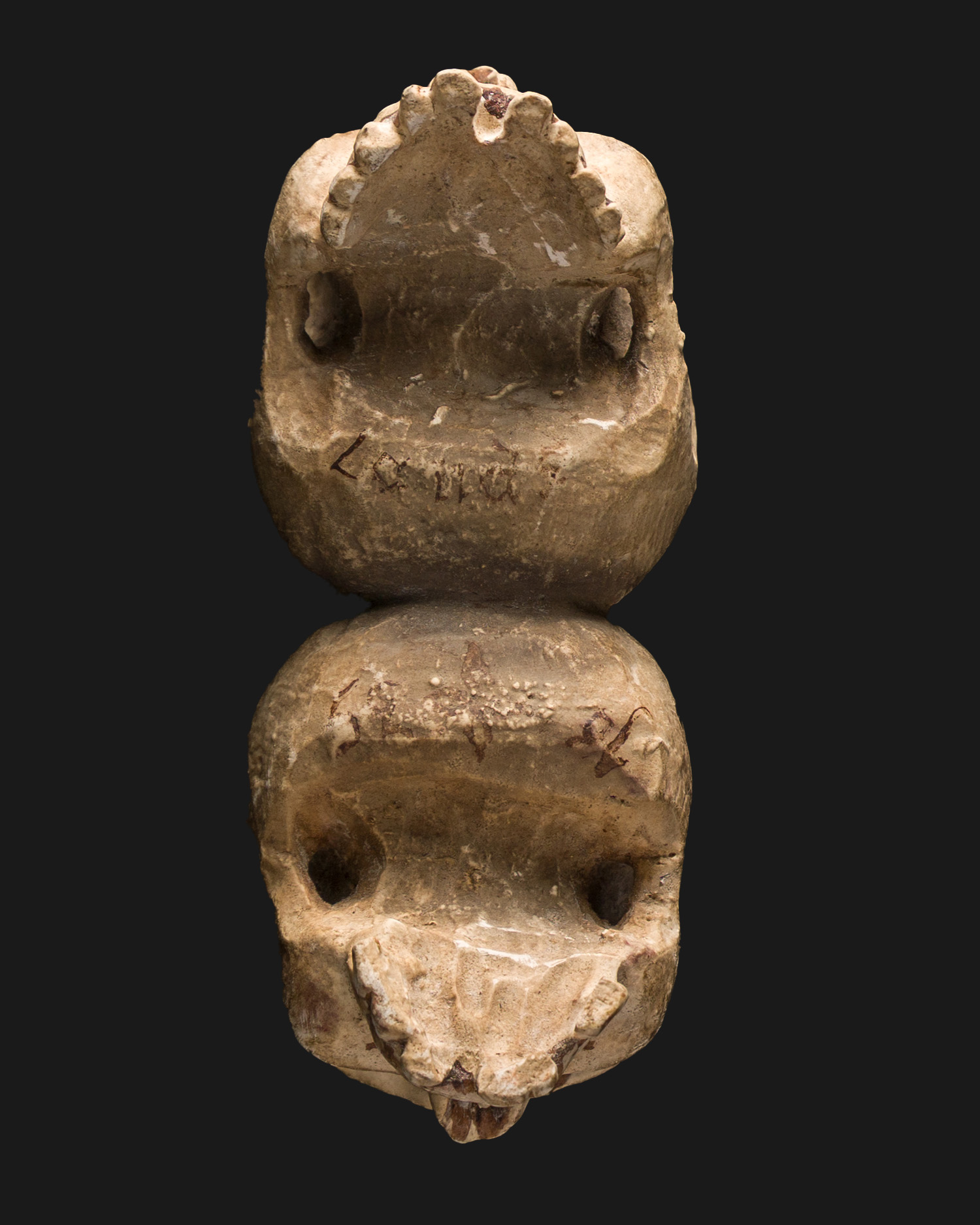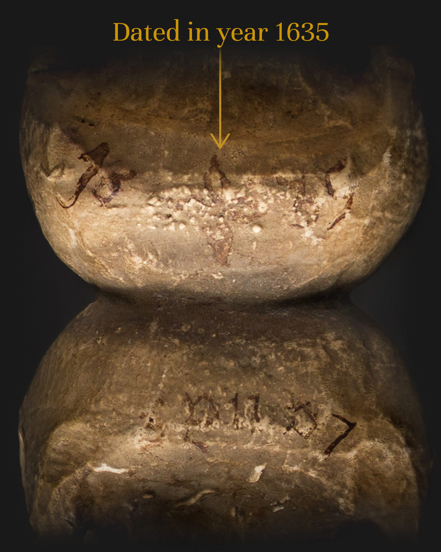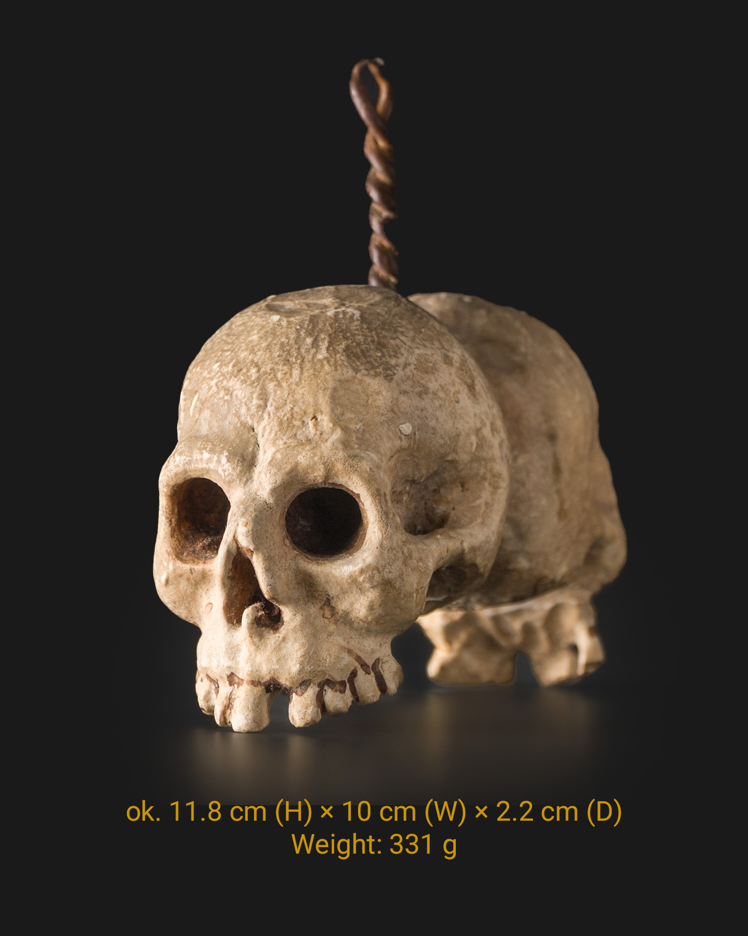 The 1635 wooden twin skulls represent memento mori iconography, reminding us of the fragility of life and the inevitability of death. The iron pendant suggests that the object served as an object of contemplation or penitential decoration in a monastery or hermitage. The combination of two skulls may symbolize the duality of soul and body, the struggle between spirit and matter, or a shared twin death.