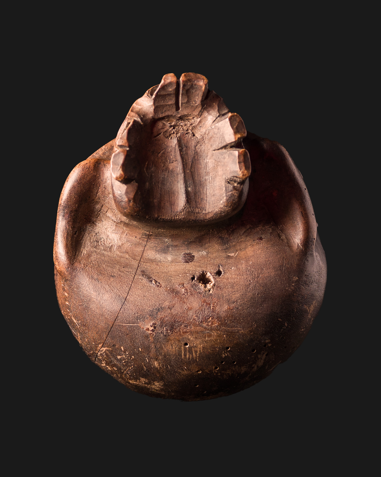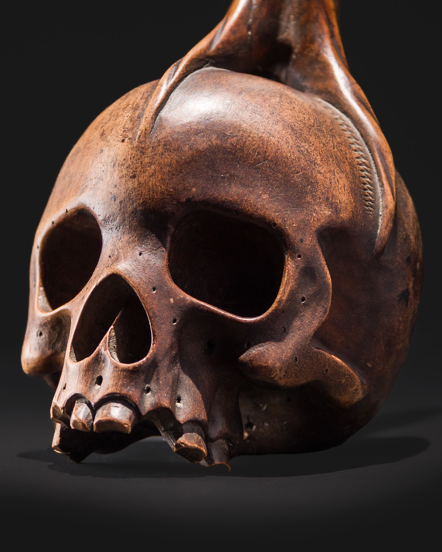 A unique dark wood sculpture depicting a realistically carved human skull, embraced from above by four massive handles with a form resembling claws or roots. The handles above join and twist into a single, compact form, resembling a stylized tree trunk, terminating in a flat-cut top surface with a full-width groove, indicating that the object was originally part of a larger structure. The skull was carved with great attention to anatomical details, such as cranial sutures, nasal openings and dentition. The form and design allow us to assume that the sculpture served as the base of a memento mori type crucifix; the missing element in the form of carved bones under the occiput means that the object now presents in a slight slant, while it was originally placed vertically.