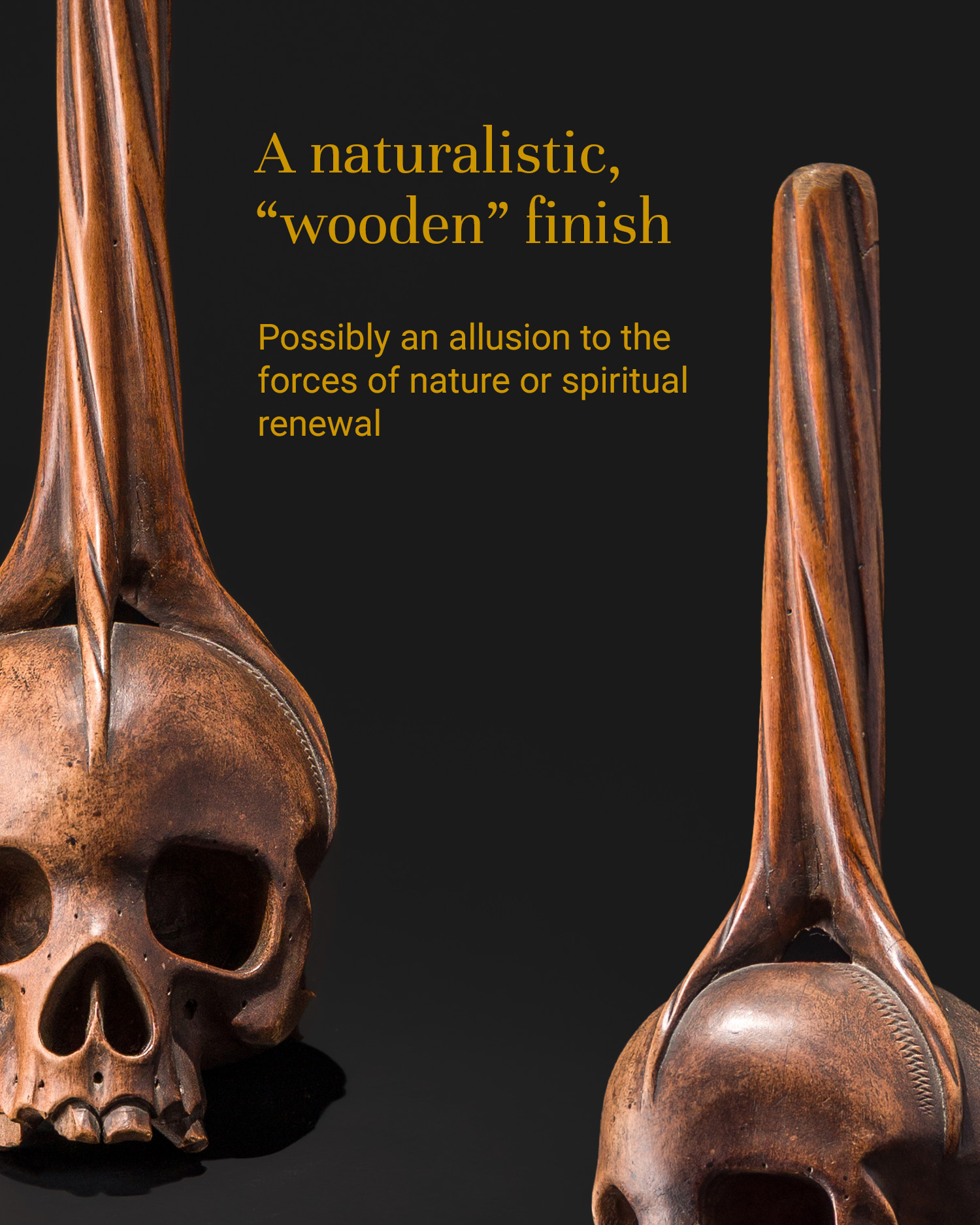 The sculpture impresses with its precision execution of anatomical details, balanced expression and natural patina of wood. The combination of the realistic skull with the dynamic, abstract structure of the finial creates a strong visual and narrative tension. Visible traces of chisel and handwork enhance its authenticity.