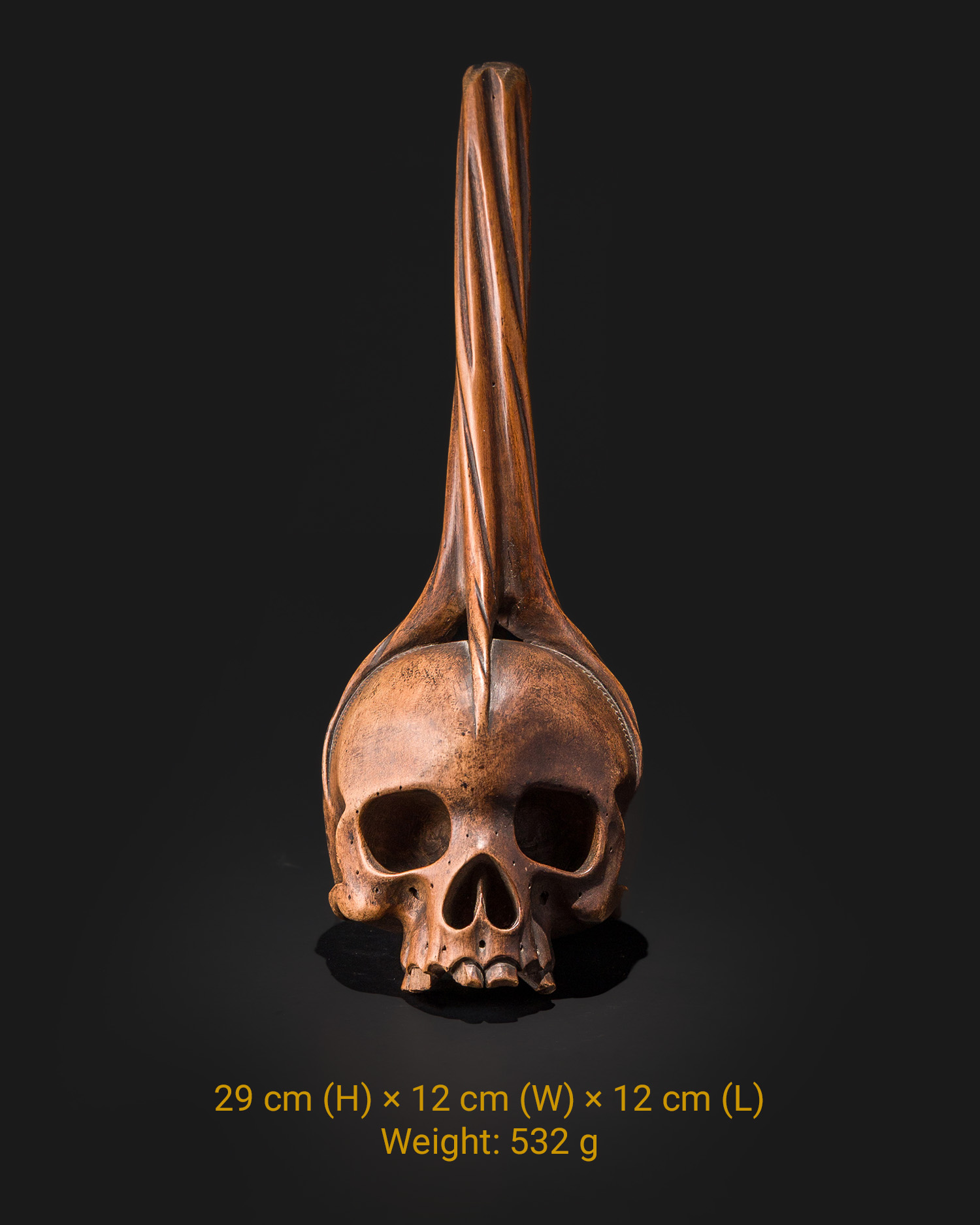 The skull is one of the oldest symbols of death and transience in Christian and occult iconography. The crowning in the form of a twisted tree trunk may suggest the idea of growth from death, rebirth or the power of nature. The form evokes associations with meditative monastic artifacts or ritual tools used in contemplative practices.