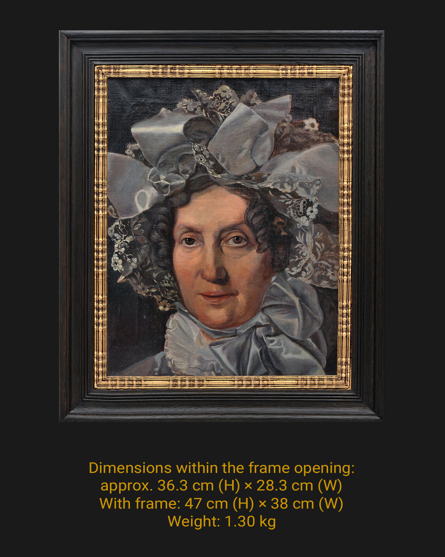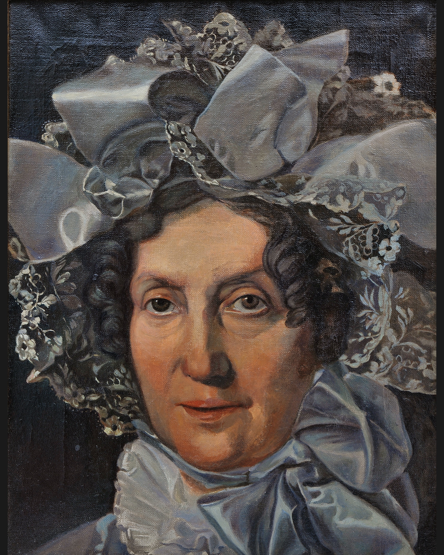 The painting depicts an elderly woman, shown in a bust view, against a dark, neutral background. The figure is wearing a magnificent headdress – a large decorative cap with lace and a wide satin bow, from under which dark curls protrude. The woman’s face has been portrayed in a realistic manner, with attention paid to fine details such as delicate wrinkles, subtle shadows around the eyes and soft chiaroscuro transitions on the skin. A large, softly placed shawl is visible under the neck, completing the elegant character of the portrait. The painting is signed on the back and framed in a Biedermeier style frame.