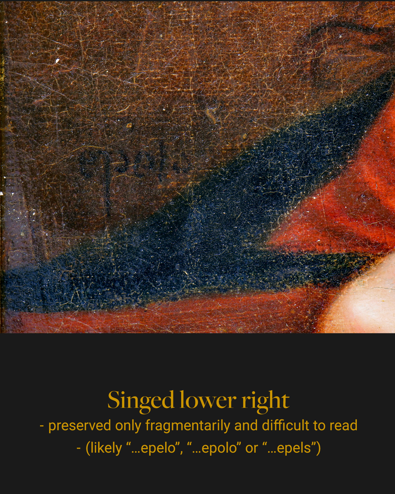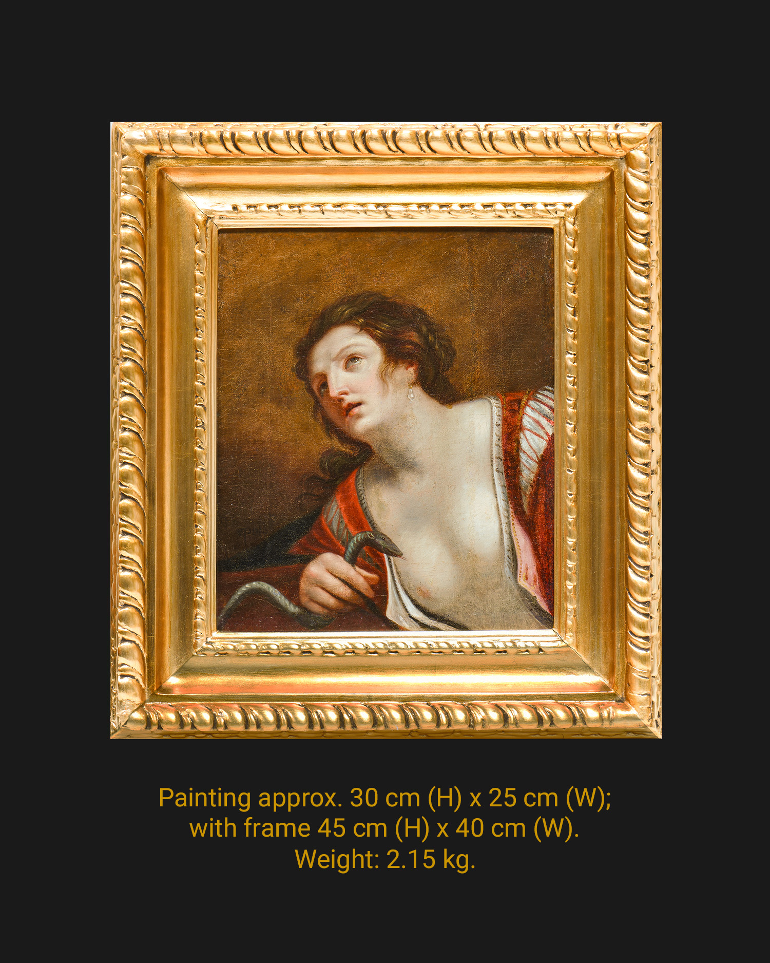 The painting depicts Cleopatra at the moment of her suicide, shown in half pose, wearing a red, unbuttoned dress with her breasts exposed and a serpent held to her chest – the only attribute that allows clear identification of the scene. The woman, with her alabaster complexion, raised head and upward gaze, is framed against a neutral, dark brown background, in keeping with the tradition of the Bolognese school. The soft chiaroscuro, idealized type of beauty and calm expression point to the influence of painting derived from the circle of Guido Reni and his continuators. The final fragment of the signature “…epolo” or “…epelo” is visible in the lower left corner, indicating the artist’s Italian origin. An analysis of the style and the way the figure is depicted allows dating the work to the 17th-18th century, with a probable place of creation in Emilia-Romagna (Italy). The painting is framed in a Baroque frame carved in wood and painted gold.