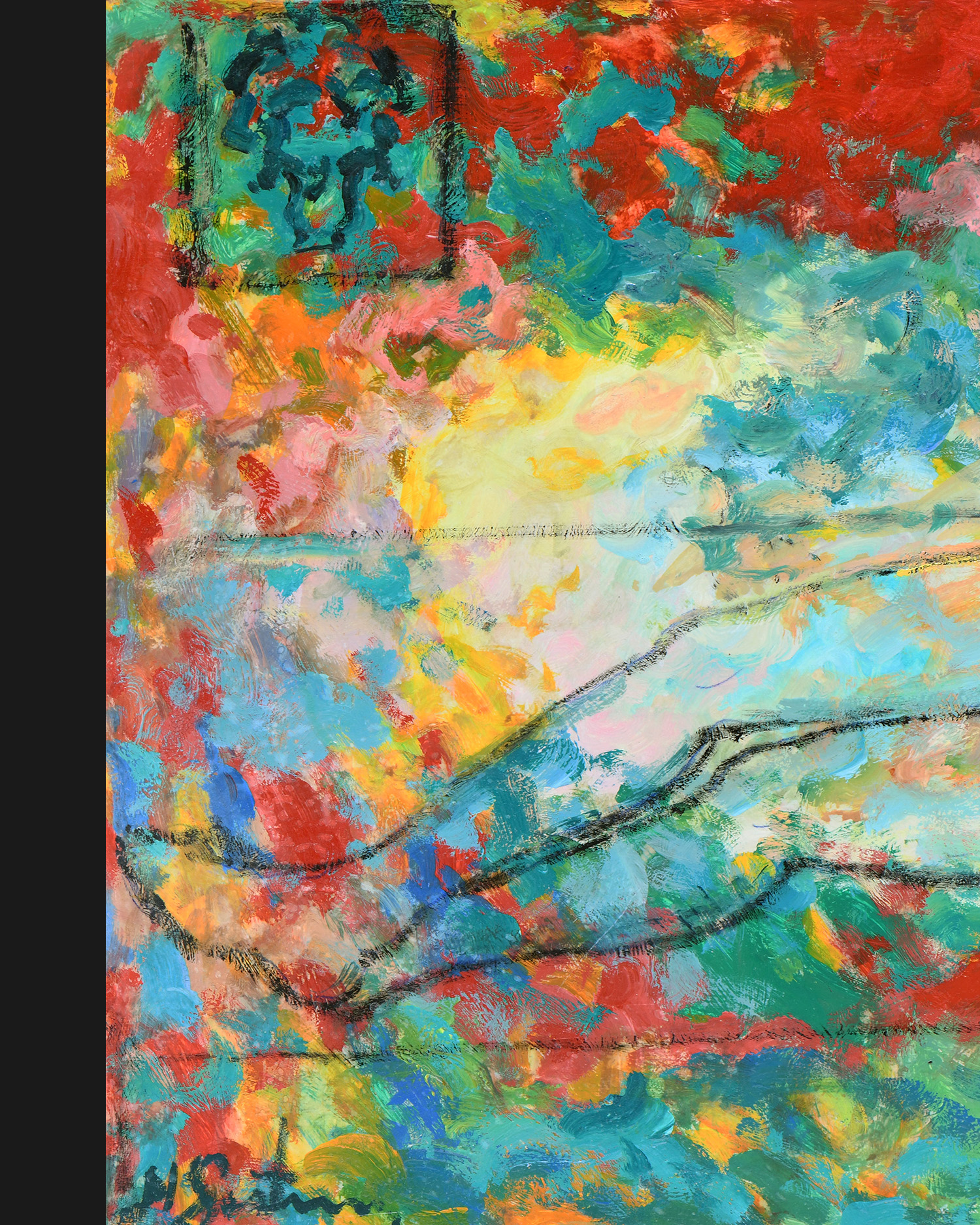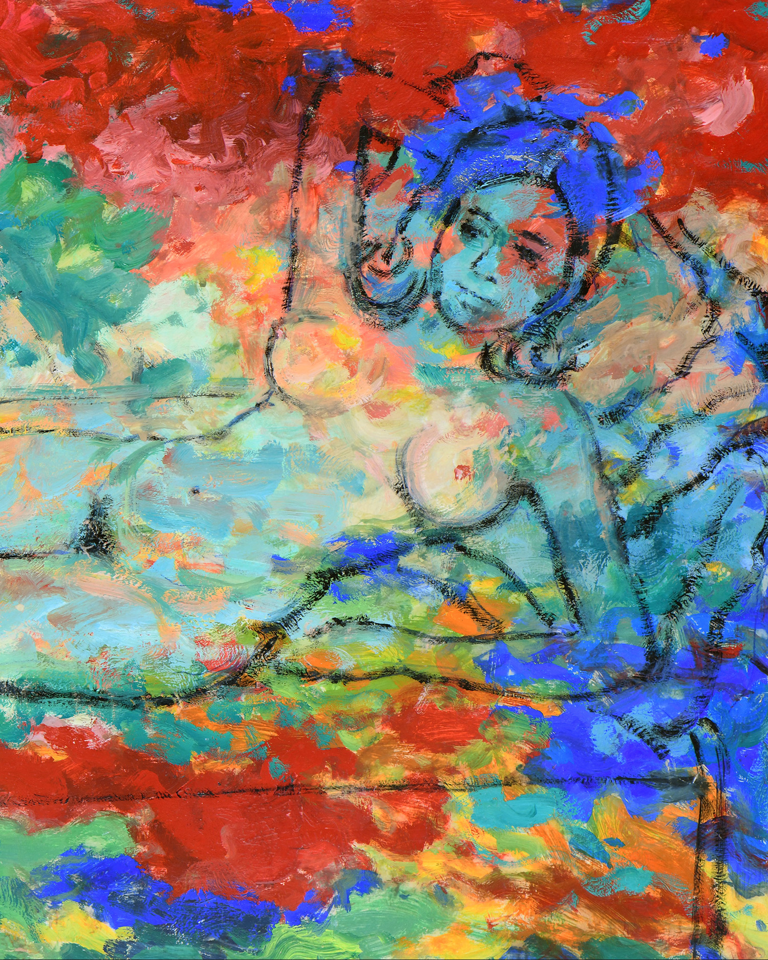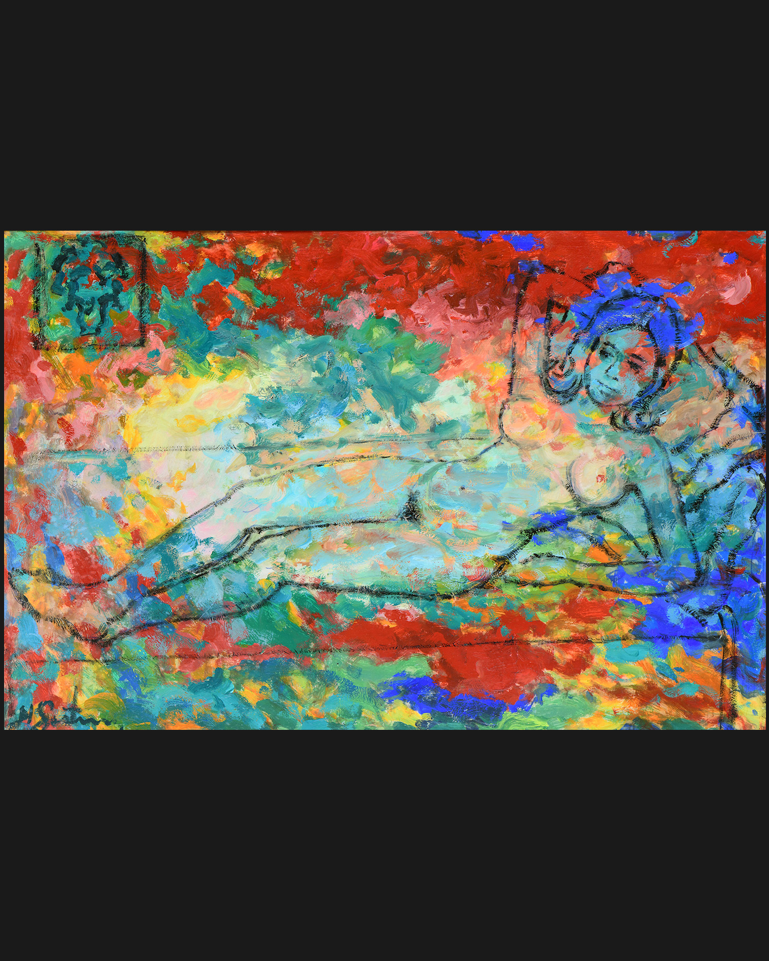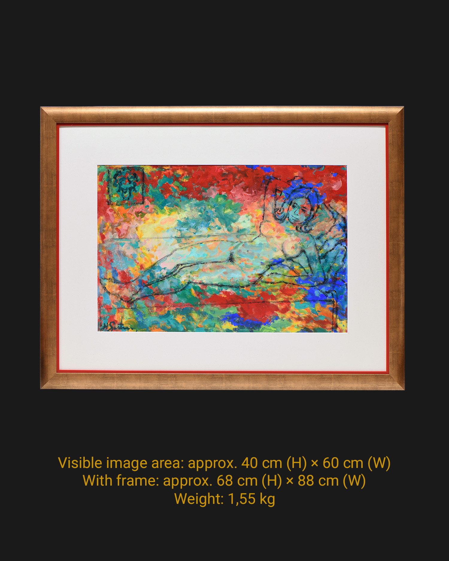 The painting depicts a nude woman in a semi-recumbent position on a bed or sofa; she supports her body with one hand and holds the other behind her head. The figure of the model, the piece of furniture and a small picture in the upper left corner (with a vase of flowers) were painted with a black outline, contrasting with a multicolored background composed of saturated patches of color in various shades of red, yellow, blue and green. The intense color palette clearly refers to the aesthetics of fauvism. The lower left corner bears Gutman’s signature. All framed in a contemporary frame.