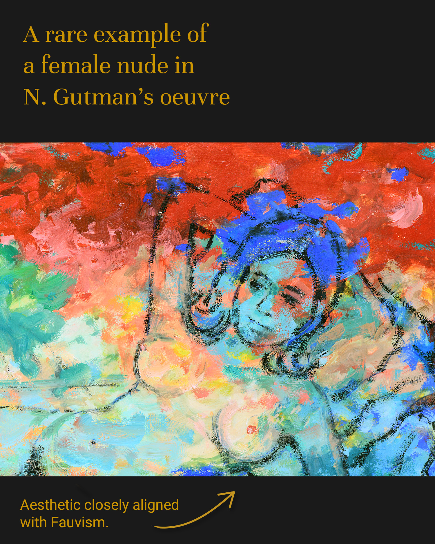 Gutman's works depicting the nude are among the exceptions, so this representation is of particular value to collectors. Its attractiveness is enhanced by the expressive color scheme, which is close to the aesthetics of Fauvism, and the way the figure is depicted, making the painting stand out from the artist's other works.