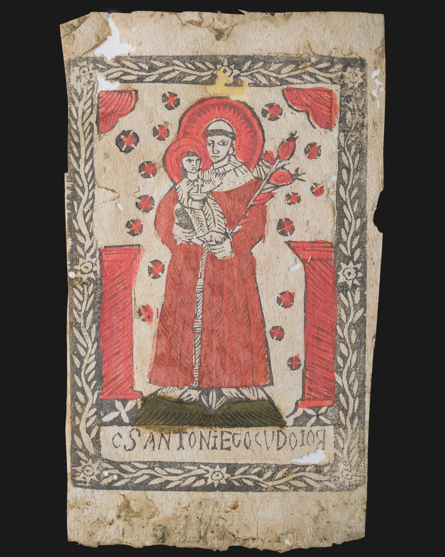 This depiction of St. Anthony of Padua with the infant Jesus is one of the clearest in Franciscan iconography. The lily in the saint's hand accentuates purity and fidelity, and the red of the robe and halo may allude to zealous preaching and merciful love (though it may also be due to the limited range of colors used by itinerant offenders). The frontal shot and decorative leafy bordure emphasize the picture's function as an indulgent souvenir - a home "altarpiece."
