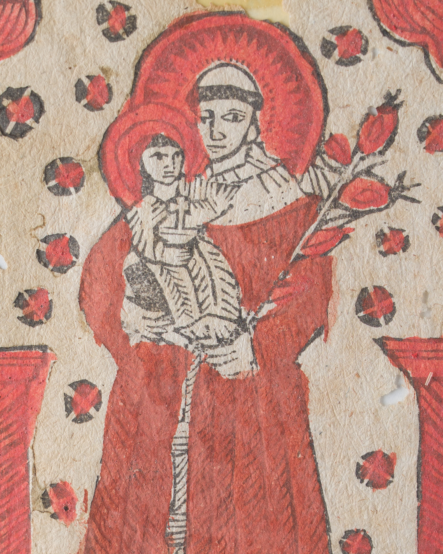 It is worth pointing out Mariampol (near Lezajsk) as a local point of indulgence circulation in southeastern Poland. It was in this pilgrimage-fair circle that small, practical sheet formats of Frontal monumentalized figure of the saint, with strong black outline, intense red in the parts of the robes and bordering with leafy motifs. Used handmade paper, and colors were applied with a stencil (patron) or brush by hand, which explains the differences in saturation and course of stains between different prints.