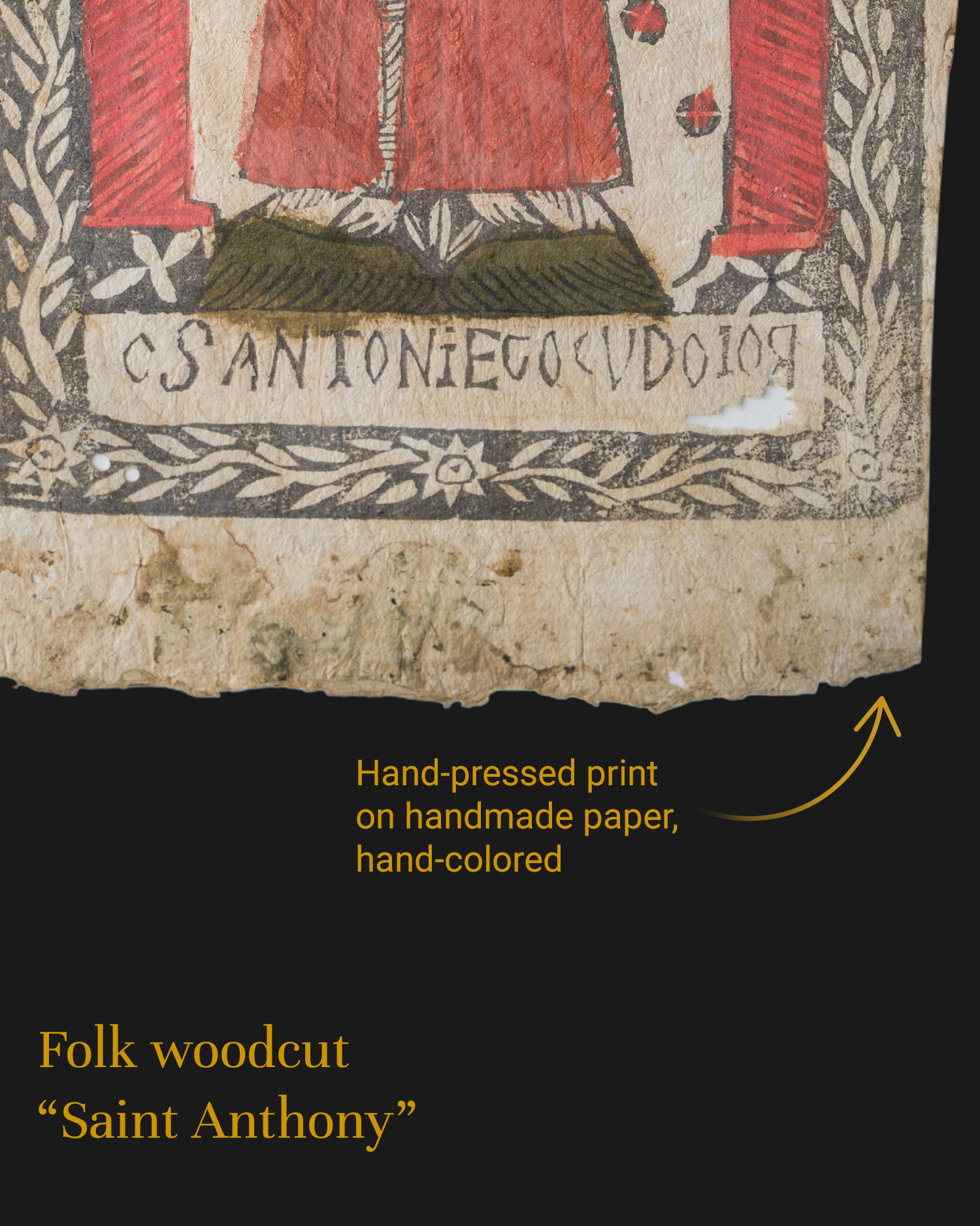 Original folk devotional woodcut from the late 18th or early 19th century, depicting St. Anthony of Padua with the Infant Jesus. The figure is framed frontally, wearing a red robe, holding the Child and flowers (lilies – symbol of purity). The shot is surrounded by a decorative leafy frame, with the inscription “OSANTONIEGOCUDOIOR” at the bottom. Framed.