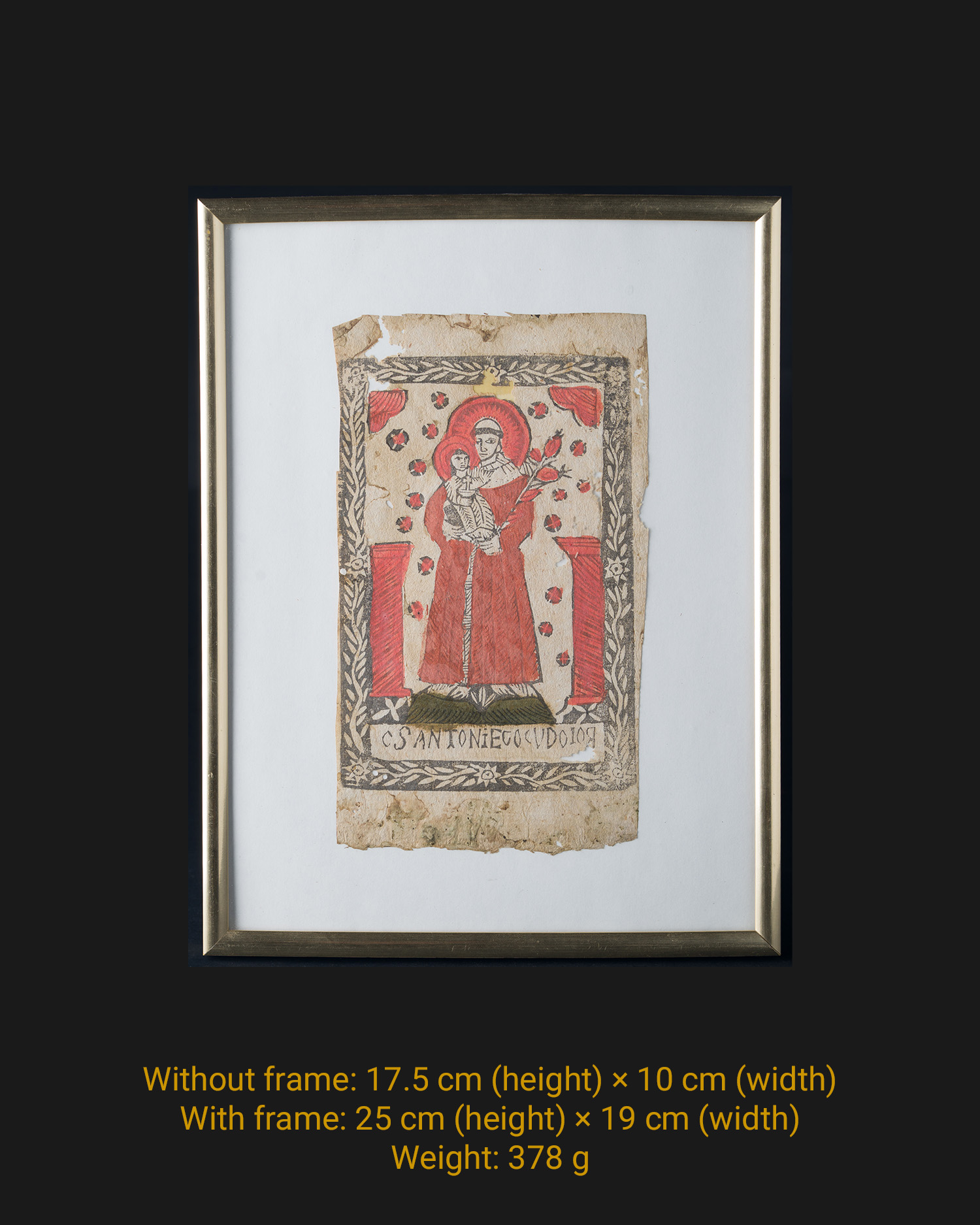 The copies preserved in Mariampol circulations illustrate well the nature of regional distribution: they were created for quick distribution at shrines and indulgences, and their iconography, like that of St. Anthony with Child corresponded to the demand of domestic piety and the practice of hanging pictures above the bed or at the home altar. The framed woodcut will work well as a A unique decorative accent in rustic, vintage and artistic arrangements or as an object of private devotion (St. Anthony - patron saint of the poor, children, people looking for lost things).