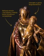 Polychrome and gilded wooden sculpture depicting the Immaculate Madonna with the Child Jesus. The figure stands on a globe entwined by a serpent – a classic motif symbolizing Mary’s victory over original sin. The Madonna, in a richly draped and gilded cloak, holds the Child on her left side. The sculpture is colorful, full of expression and dynamism.