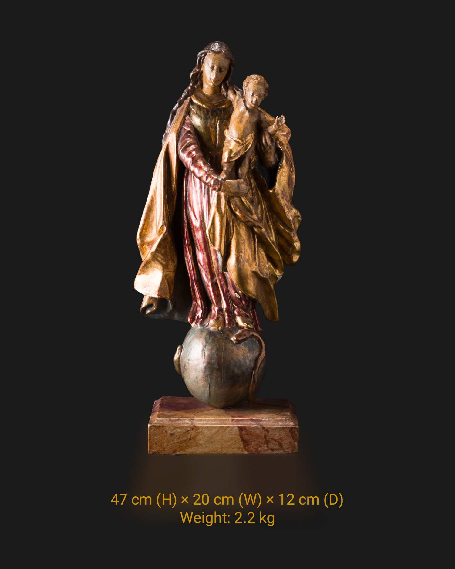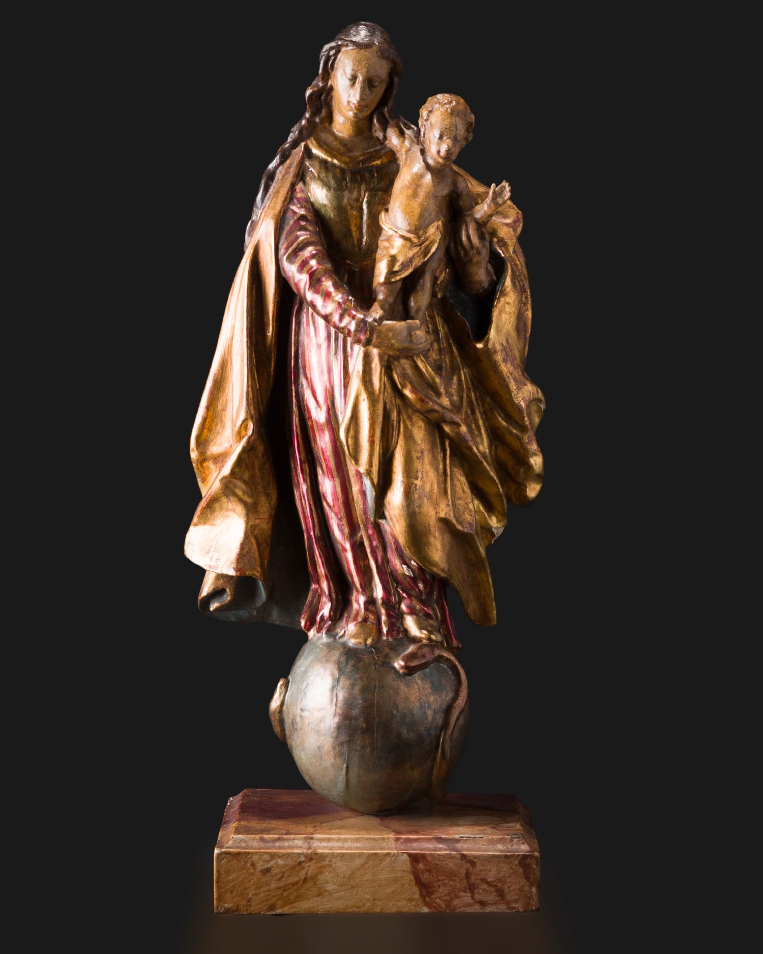 The figure depicts the Immaculate Madonna trampling the serpent entwining the globe, constituting a classic motif of Baroque Catholic art, which symbolizes Mary's triumph over original sin. The Child Jesus in a gesture of blessing reinforces the spiritual message of this unique composition.