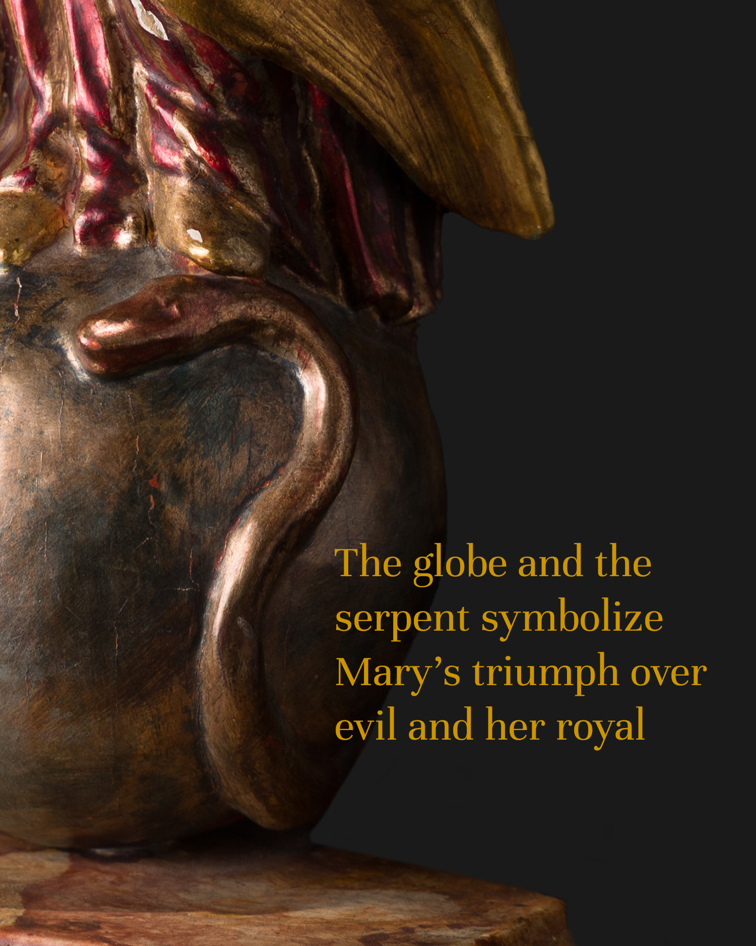 The motif of the globe and the serpent directly refers to the Apocalypse of St. John and the biblical prophecy from the Book of Genesis, which speaks of a woman crushing the serpent's head. Over time, this figure was identified with Mary in Christian art, which found particularly strong expression in Baroque sculpture with a Marian theme.
