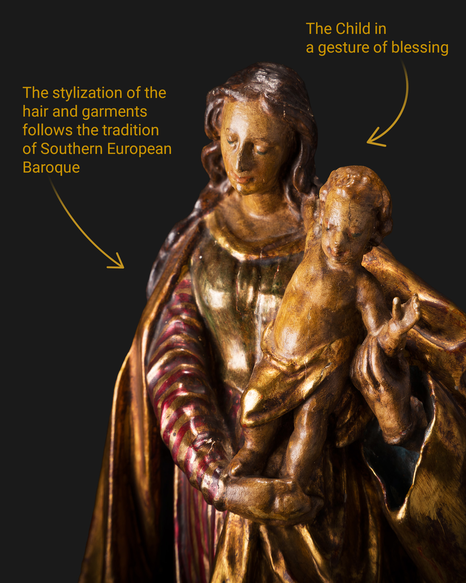Baroque sculptures of the Immaculate Mary with Child experienced a peak in popularity in the second half of the 18th century and early 19th century, especially in Southern European countries. They could be found in monasteries, churches, and private chapels of the faithful.