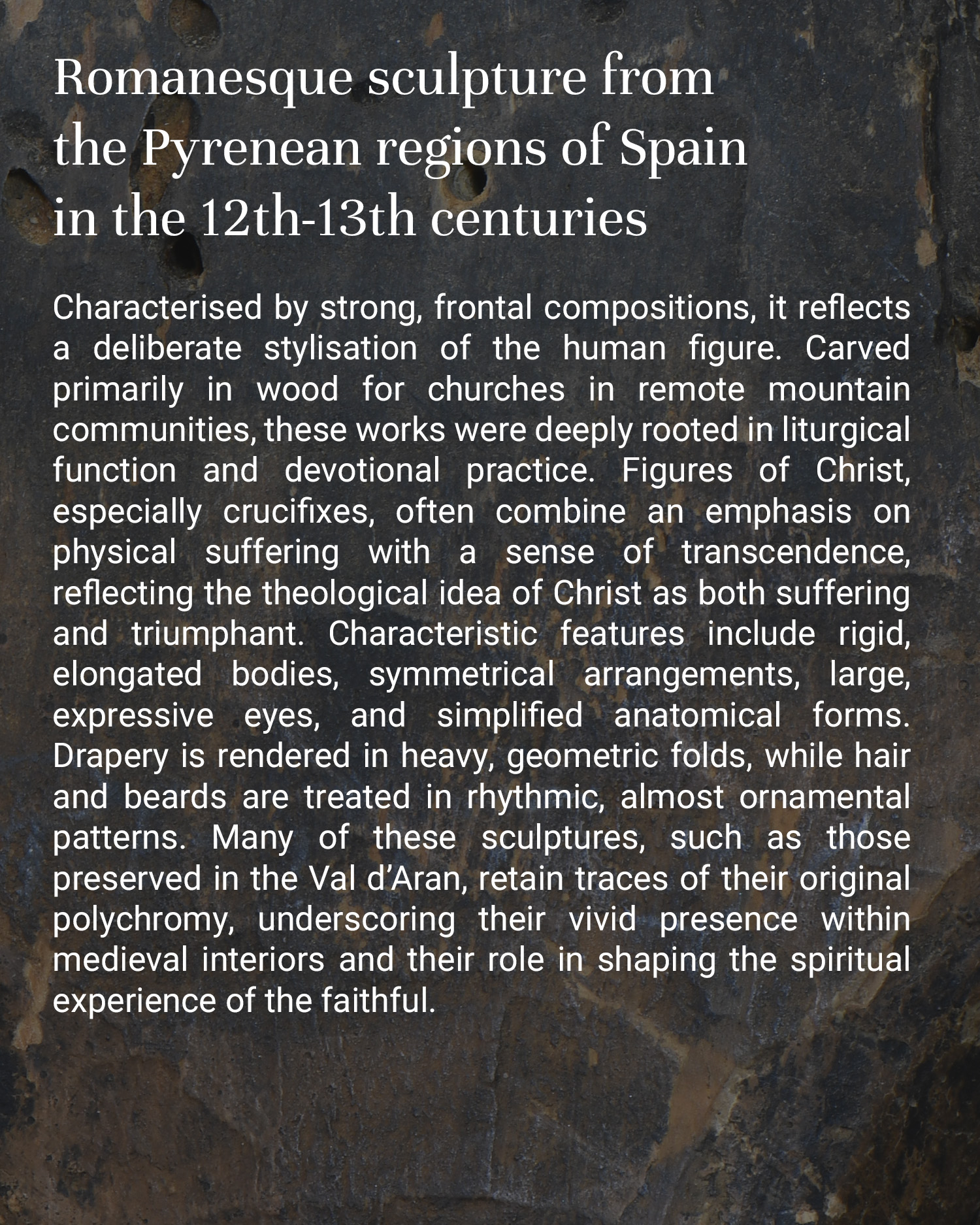His gaze, however, is slightly lowered, emphasized by a prominent nose and large, spreading ears that frame his face. His hair falls symmetrically on his shoulders; a peculiar hairstyle draws attention – the hair, separated by a parting on top of the head, is arranged in rollers covered with densely diagonal cuts. Very similarly arranged hair, resembling braids, has the famous statue of Christ of Mig Aran, located in the church of Sant Miquèu de Vielha (Val d’Aran valley). The beard and mustache end in artificial, volute curls.