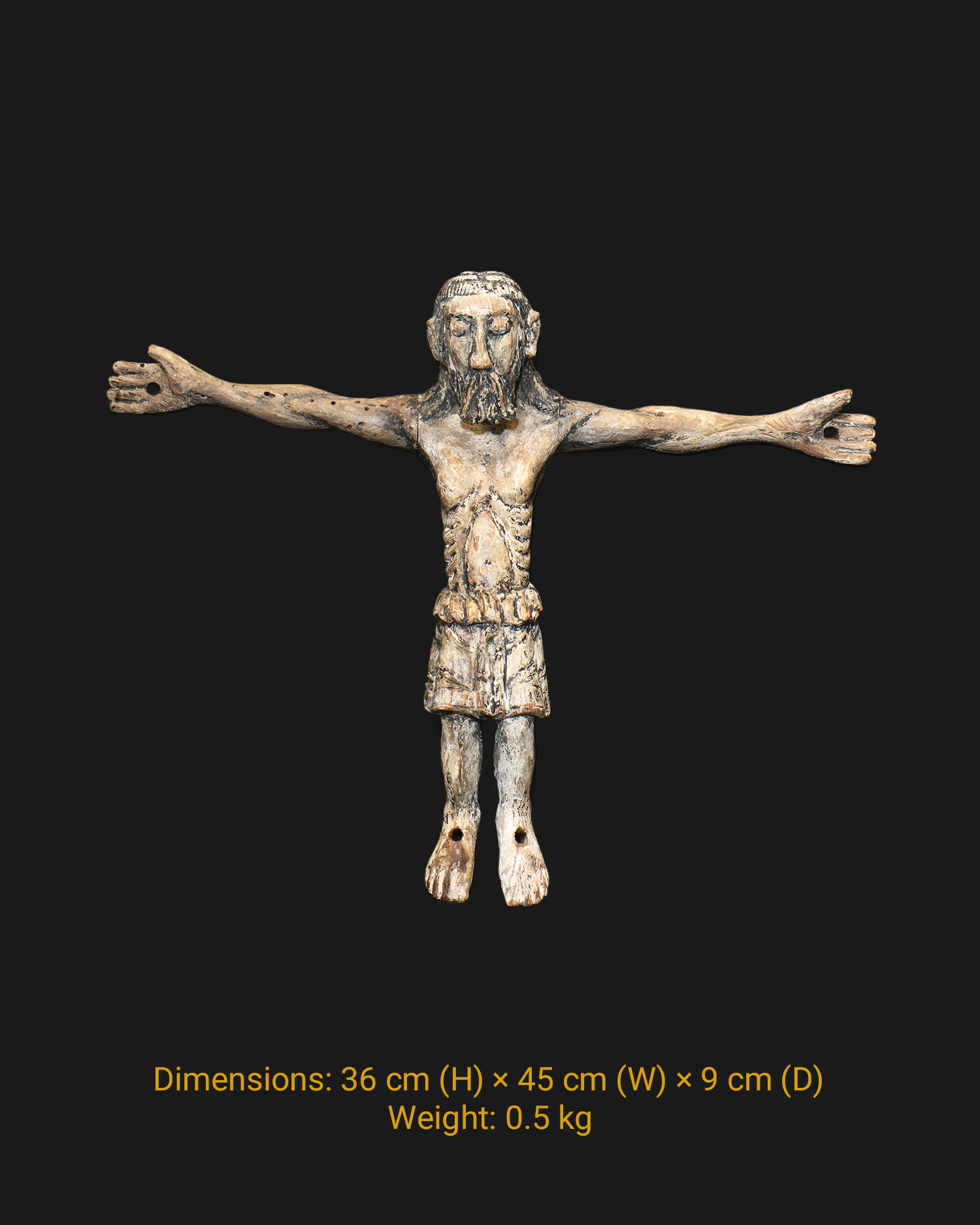 The specially sculpted, emaciated chest, including the ribs and middle part of the sternum, is meant to emphasize the suffering of Christ.