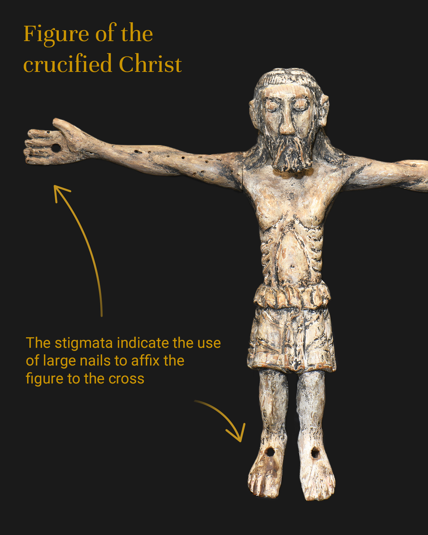 Loosely hanging legs with larger-than-average feet contribute to the dramatic overall appearance. Although this exquisitely preserved sculpture depicts a tortured body, Christ triumphs over death, symbolizing an idealized depiction of suffering in a majestic, upright posture with eyes wide open.