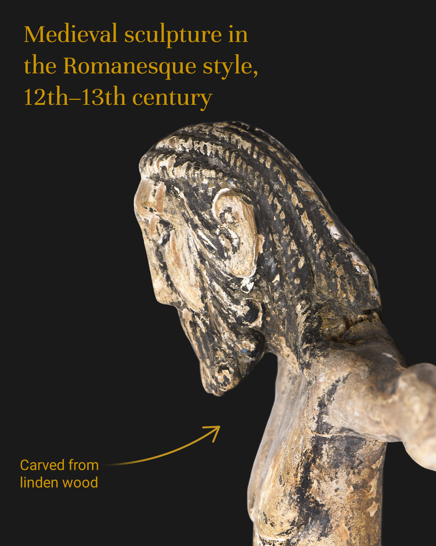 The sculpture impresses with the pronounced rigidity of the body, typical of early Roman depictions. The calm yet poignant expression of Christ’s face is emphasized by huge, forward-facing eyes set in deep eye sockets.