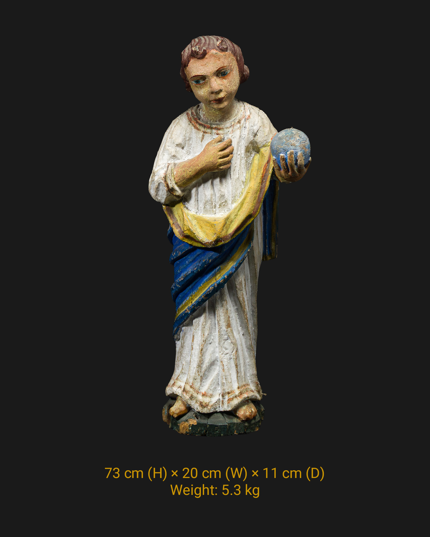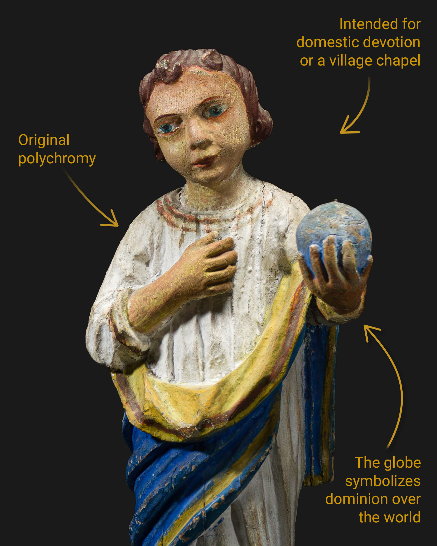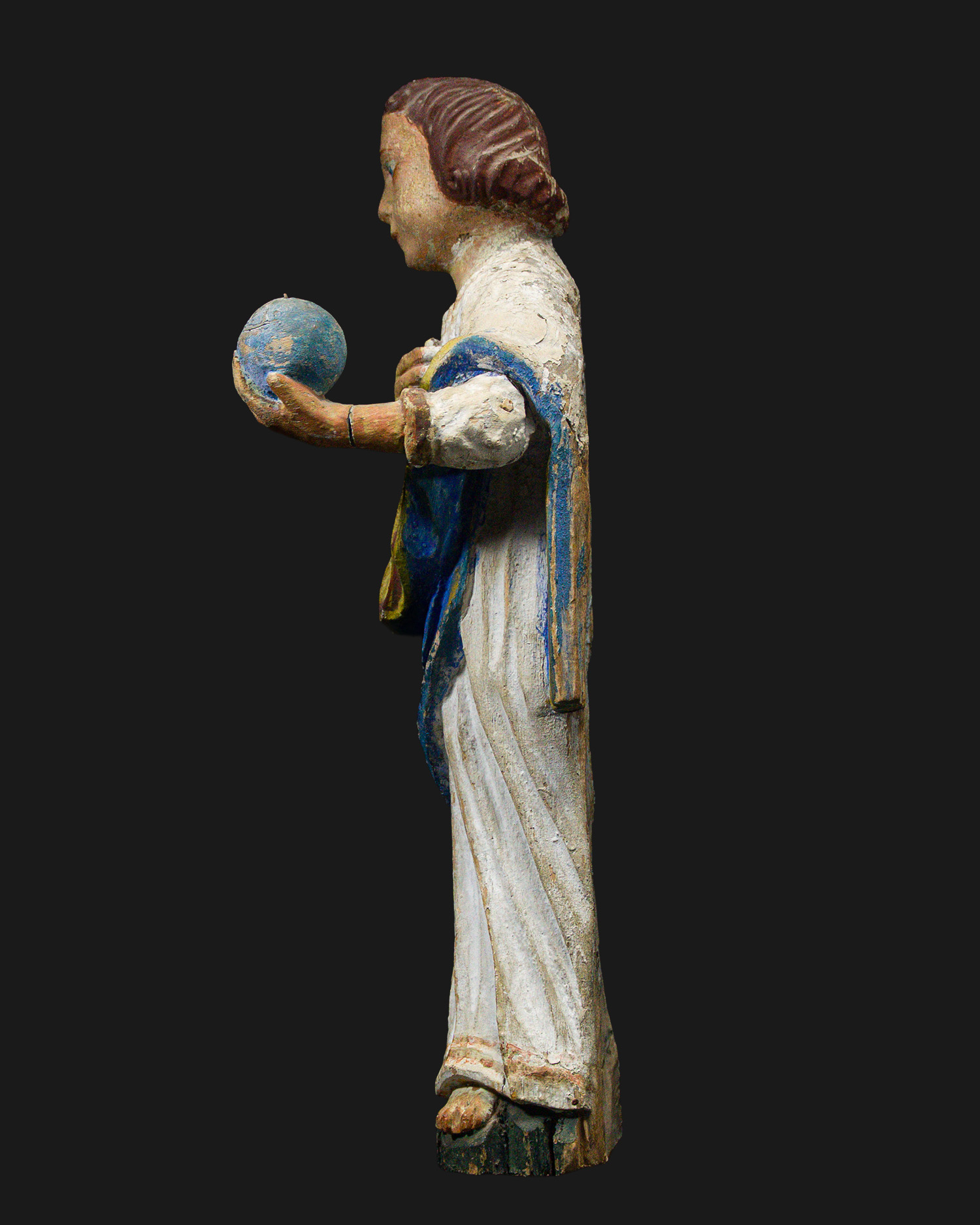 In Western iconography, the Salvator Mundi motif has appeared since the 13th century, but during the Baroque period it gained special significance as a symbol of Christ's authority over the mortal world. Sculptures with a globe were often placed in domestic altars or monastery refectories as a sign of protection and blessing.
