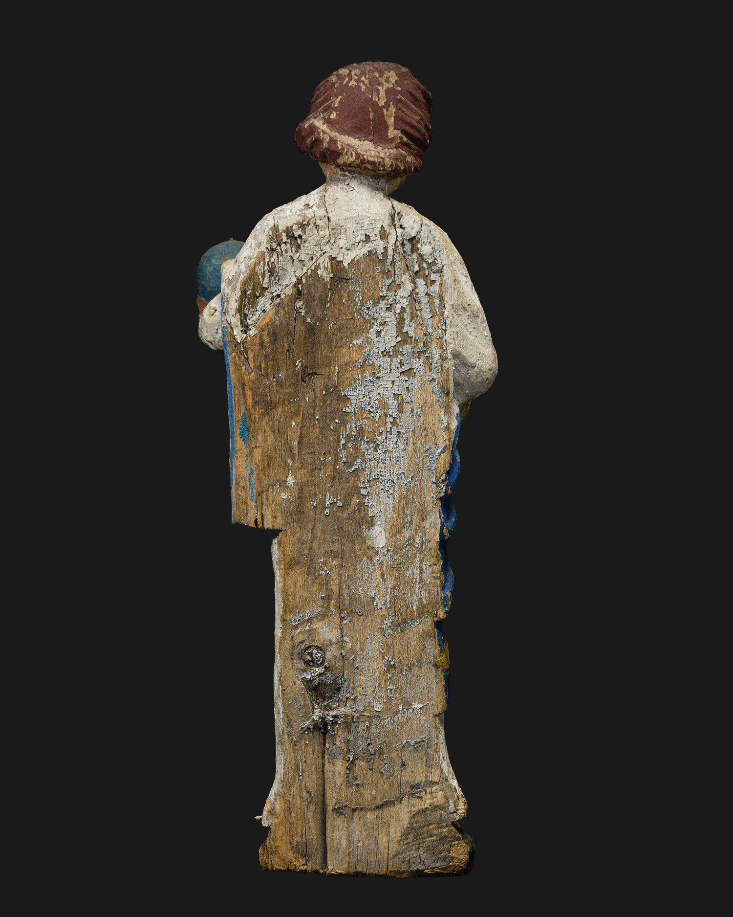 The figure is dressed in a white tunic and blue coat with yellow piping. Remnants of the original polychrome and natural traces of use are visible. The simplified modeling, linear folds and expressive face indicate a folk workshop from southern Poland, representing the late Baroque tradition of devotional sculpture.