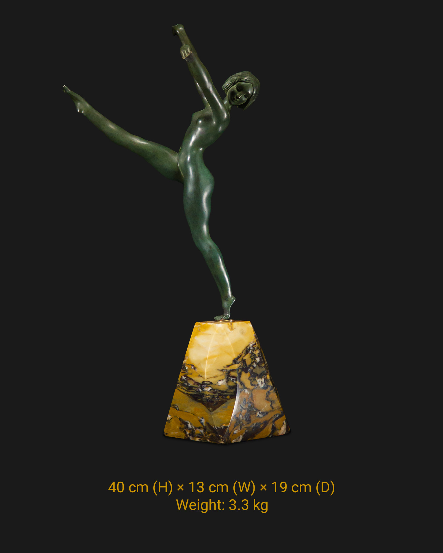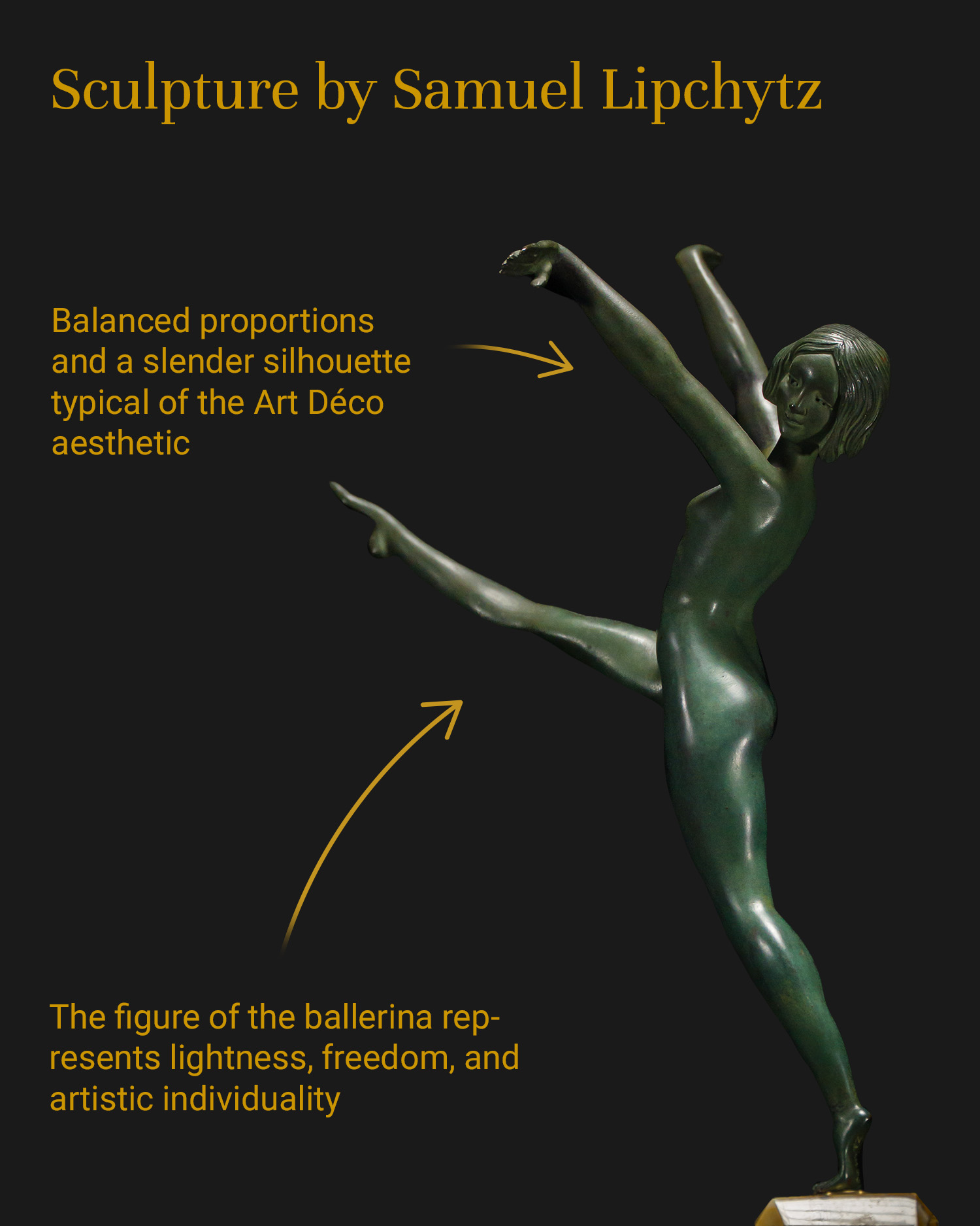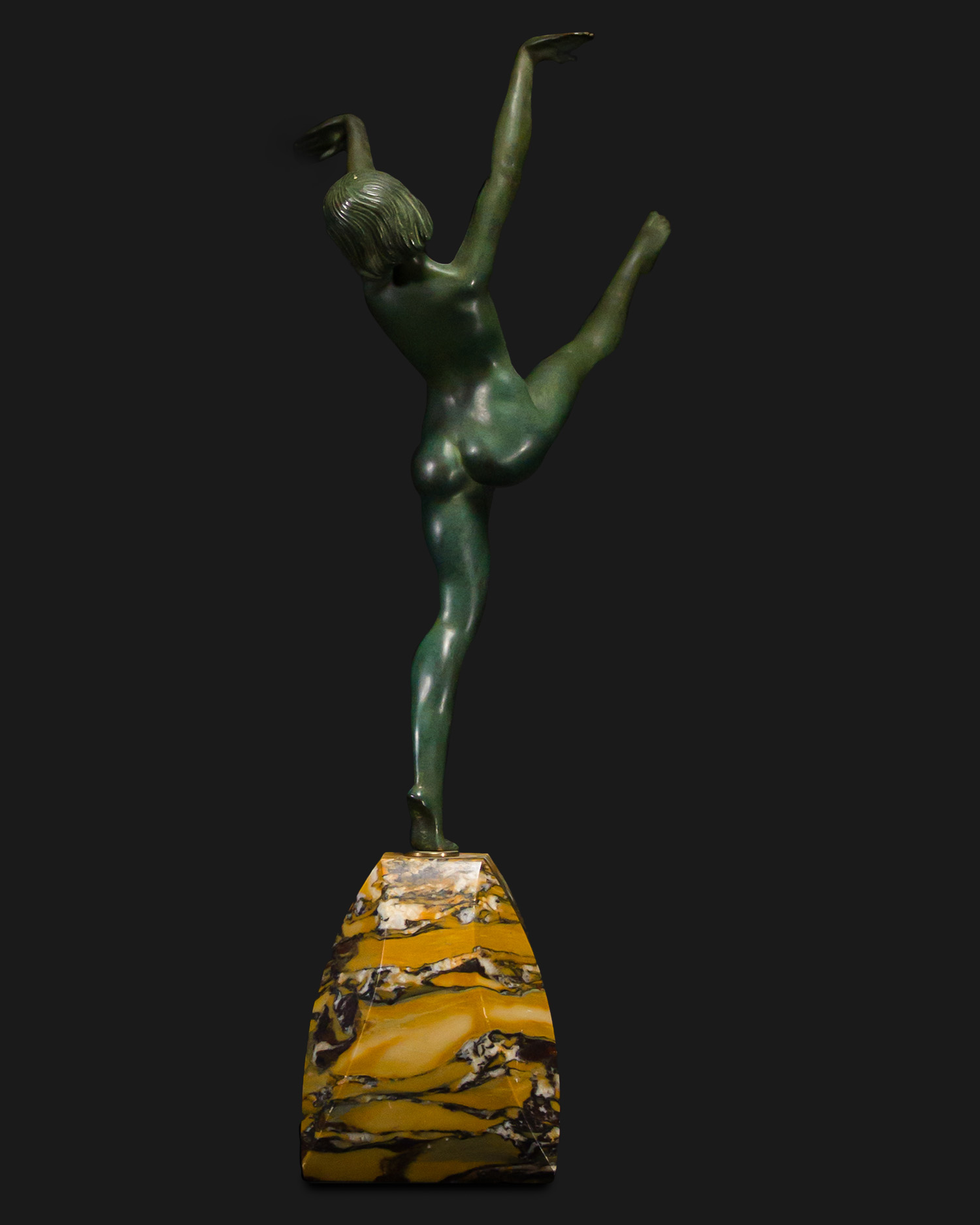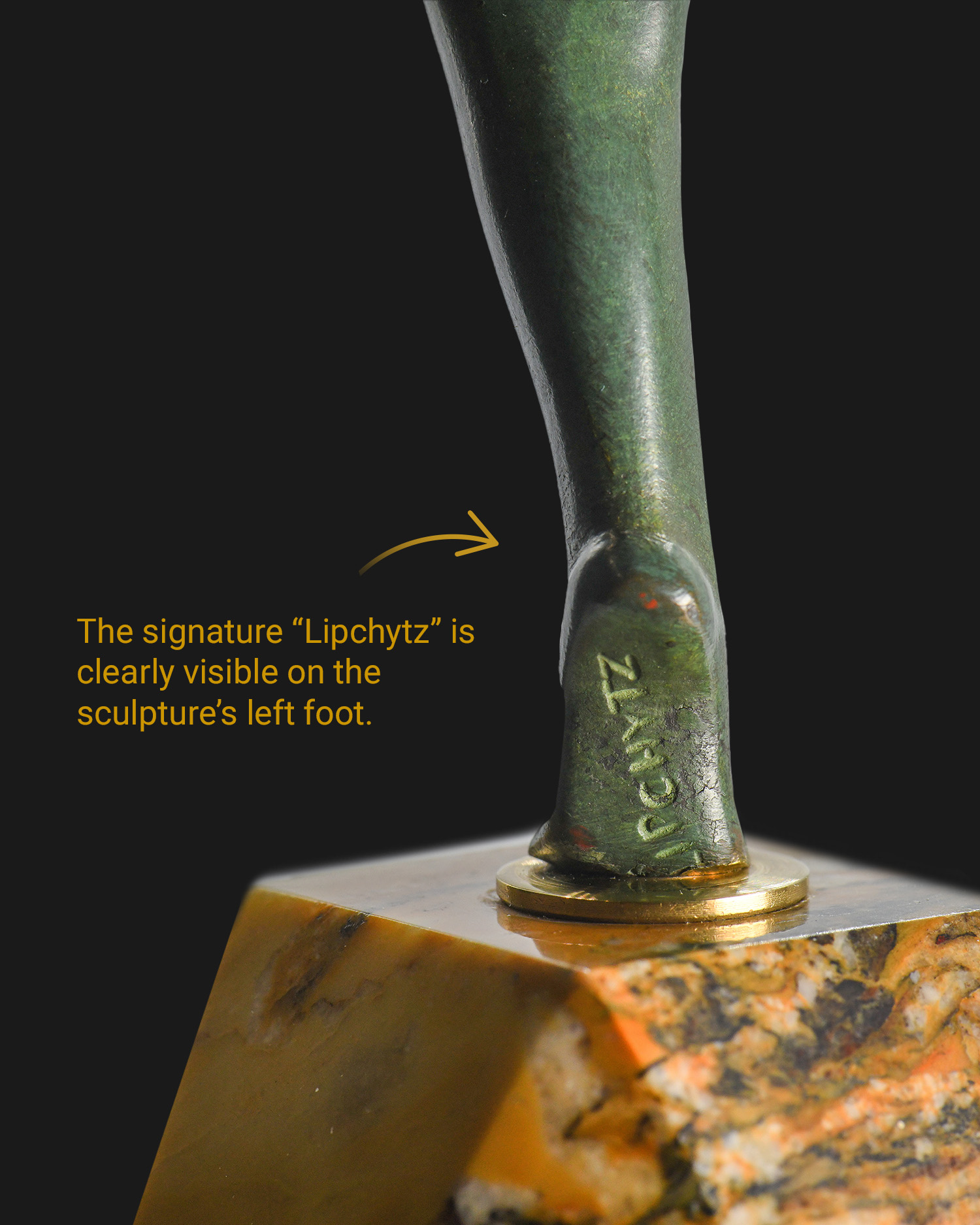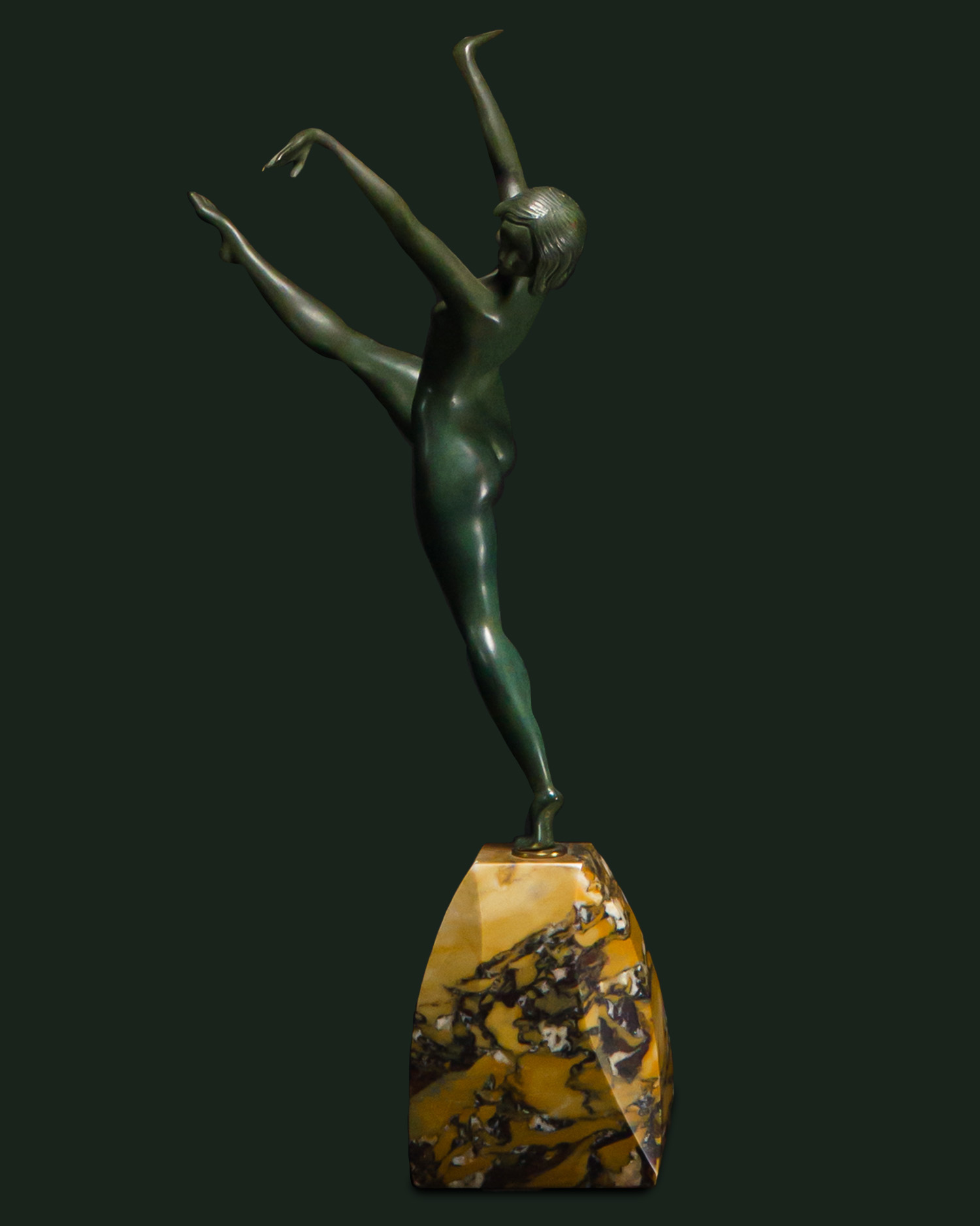 Sculpture by Samuel Lipszyc in the Art Déco style depicting a nude ballerina in a dynamic pose, balancing on one foot. The sculpture is made of green patinated bronze, set on a marble pedestal with decorative contrasting veining. The dancer’s dynamic silhouette and streamlined lines are characteristic of the modernist aesthetic of the 1920s. The figure exudes lightness, grace and modern elegance, capturing the spirit of the Art Déco era. The work is signed “Lipchytz” on the left foot.