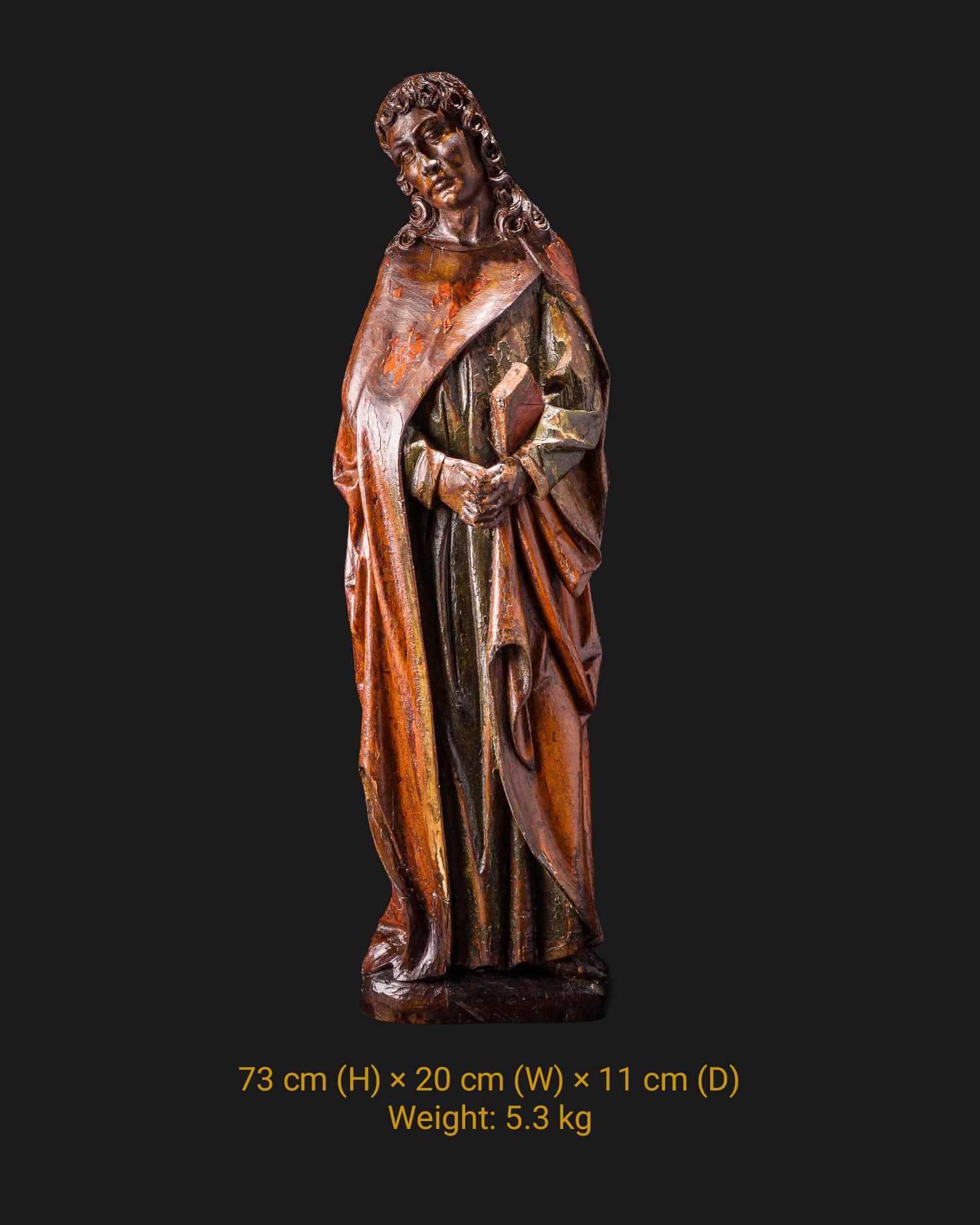 Full-plastic sculpture depicting St. John the Evangelist , made of wood, dated around 1500. The figure is shown in counterpoint, with a slightly bowed head and entwined hands holding a book – an attribute of the Evangelist. The sculpture is preserved in its original polychrome, with a visible structure of pigment layers and natural cracking of the wood.