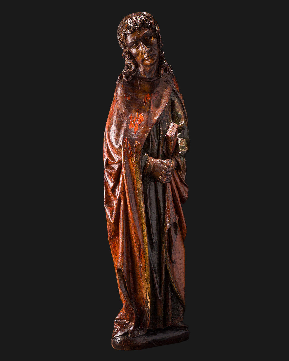 Full-plastic sculpture depicting St. John the Evangelist , made of wood, dated around 1500. The figure is shown in a contrapposto, with a slightly bowed head and entwined hands holding