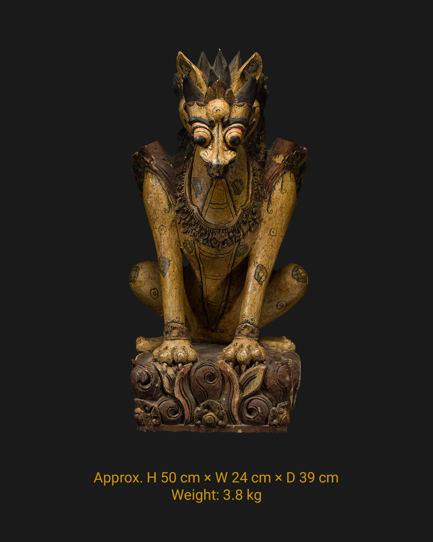 A striking polychrome wood sculpture depicting Singa Barong – a mythical winged lion, known from Balinese and Javanese traditions. The creature is shown in a watchful position, sitting on an ornate base with its mouth open and teeth bared. The figure’s appearance is completed by its distinctive bulging eyes, curled tail and mane. Its body is covered with linear motifs resembling tattoos, its breast is adorned with a wide necklace and its front paws with bracelets. The sculpture was most likely associated with a protective function, both in temple and domestic spaces.