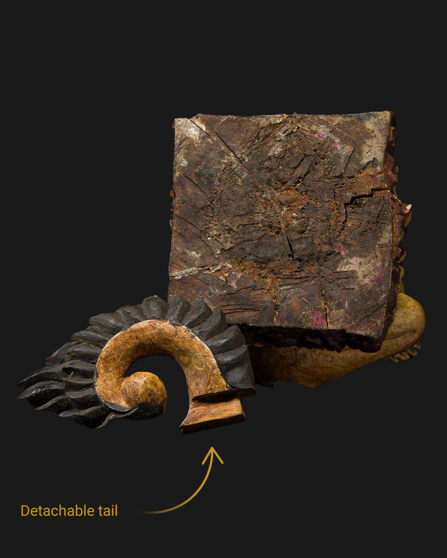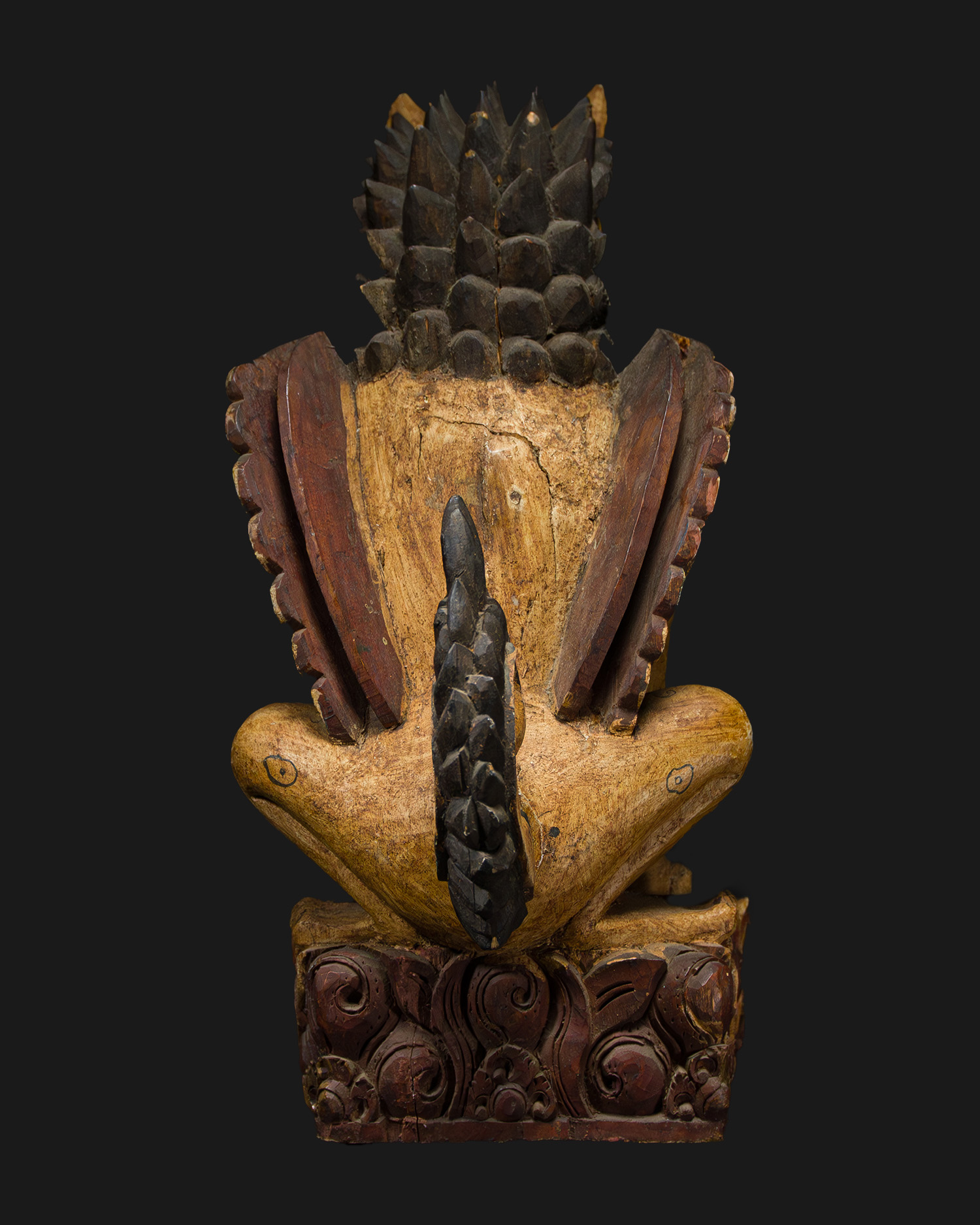 Although the author of this carving remains anonymous, its style indicates a trained woodcarver from a workshop specializing in sacred ritual art. In Indonesia, there were hereditary families of artisans responsible for creating temple furnishings and ritual objects, and the woodcarving technique was passed down orally from generation to generation. The designs used in ritual art often had meanings known only to the priests, which emphasized their unique, spiritual nature. As a result, these artisans were seen as intermediaries between the human world and the spirit realm, and their works - such as the Singa Barong representation - served not only a decorative function, but primarily a protective and symbolic one.
