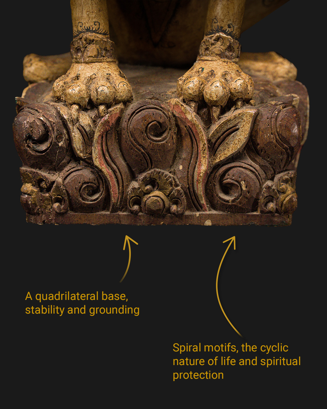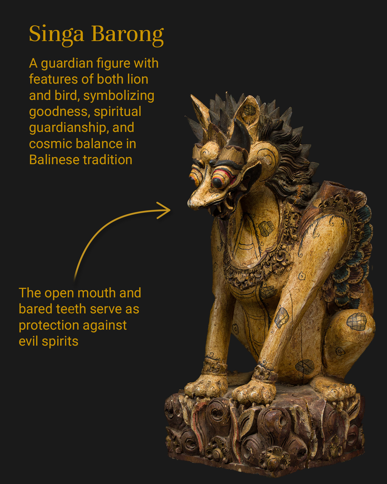 The sculpture depicts Singa Barong - a legendary guardian with features of a lion and a bird, symbolizing the forces of good, spiritual protection and cosmic balance. His open maw, fangs and expressive eyes were supposed to ward off evil spirits, providing protection to the place at which he was placed.