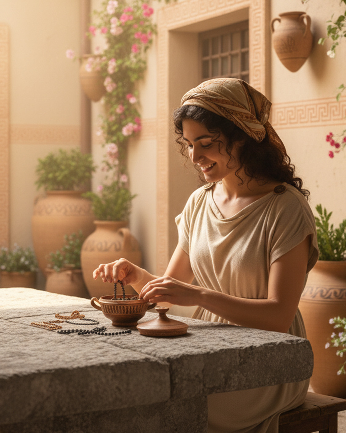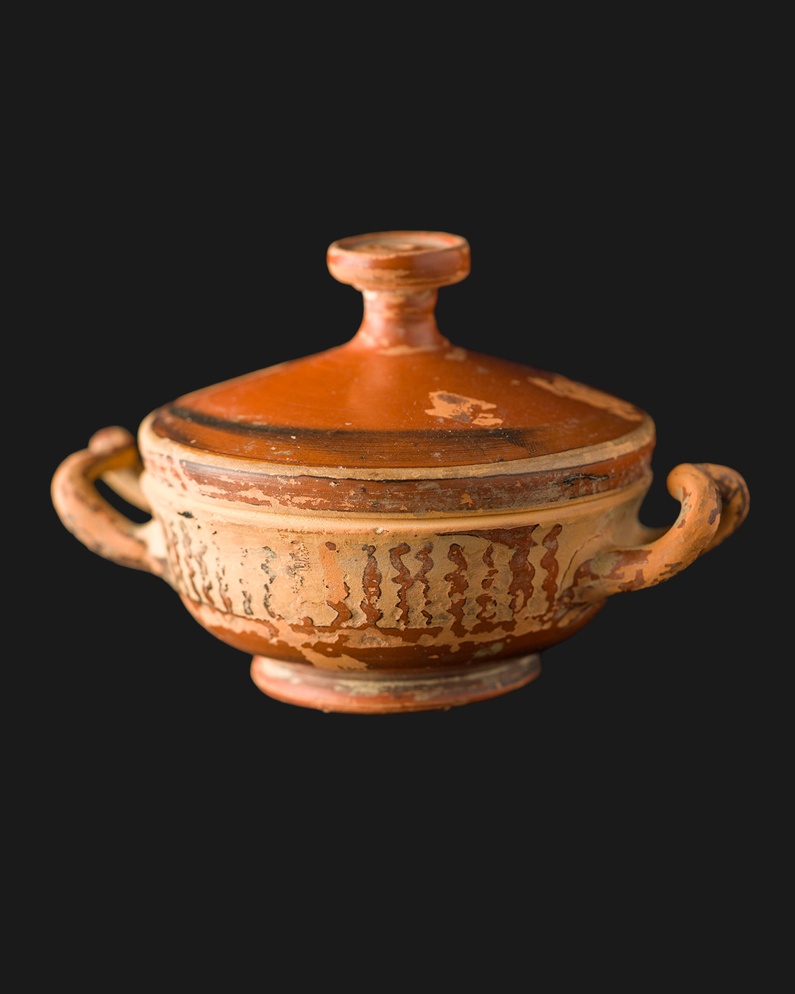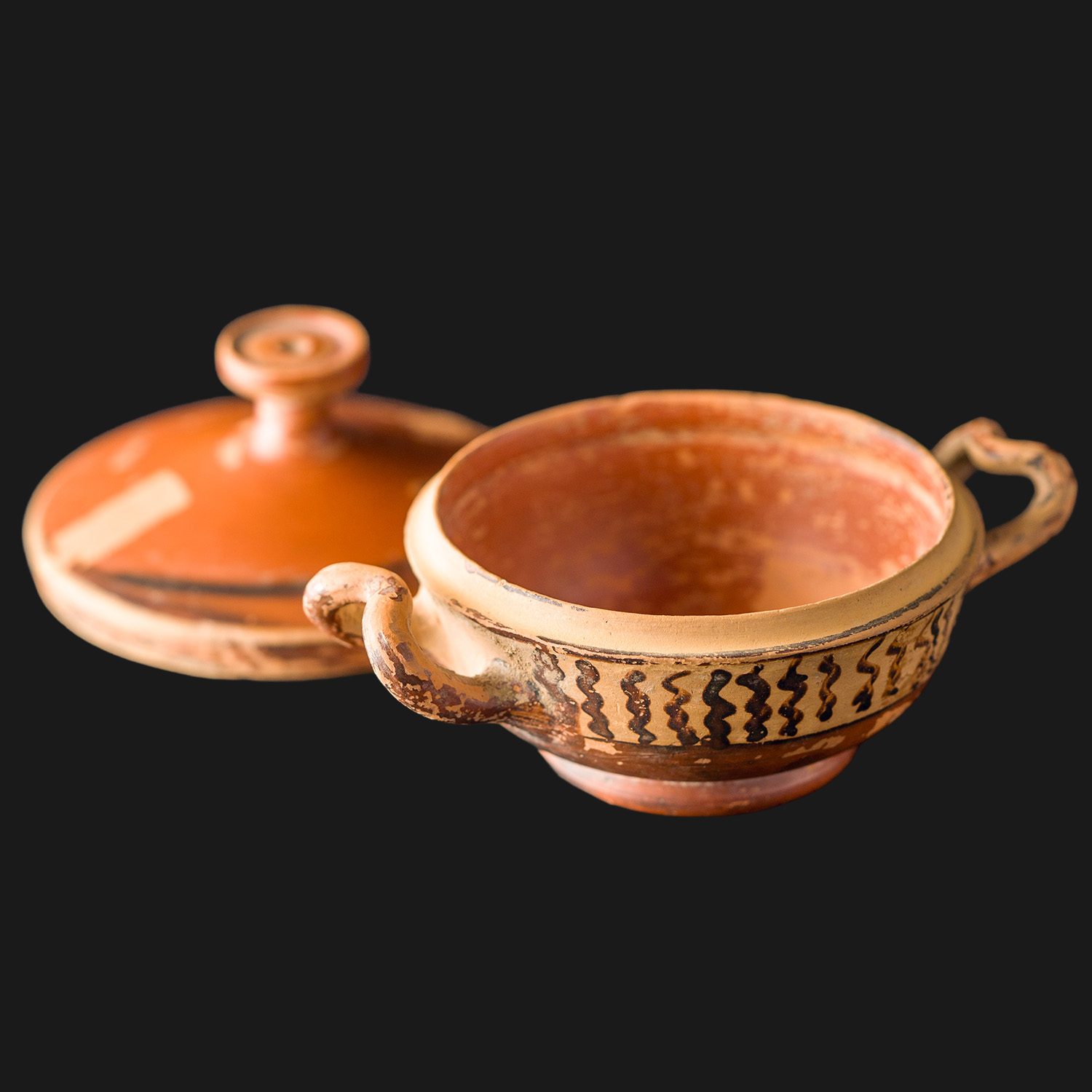 Małe, starożytne naczynie ceramiczne typu lekanis, datowane na V wiek p. Ch., pochodzące prawdopodobnie z Beocji w środkowej Grecji. Naczynie o niskim, spłaszczonym korpusie, z dwoma cienkimi, wznoszącymi się uchwytami oraz dopasowaną pokrywką zakończoną płaskim guzkiem. Wykonane z drobnoziarnistej gliny o pomarańczowo-czerwonym odcieniu, pokrytej ciemnym firnisem i zdobione pasem pionowych zygzaków w kolorze brunatno-czarnym.