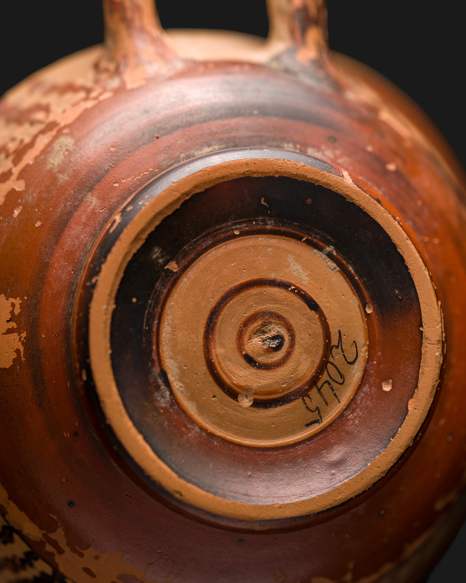 Na spodzie widoczna jest niewysoka stopka pierścieniowa z koncentrycznymi kręgami i śladem po tokarce. Zachowała się numeracja muzealna naniesiona tuszem. Powierzchnia naczynia wykazuje typowe ślady wypału redukcyjnego, miejscowe przebarwienia, ubytki firnisu i osad mineralny, jednak całość zachowała się w pełnej formie z oryginalną pokrywką.