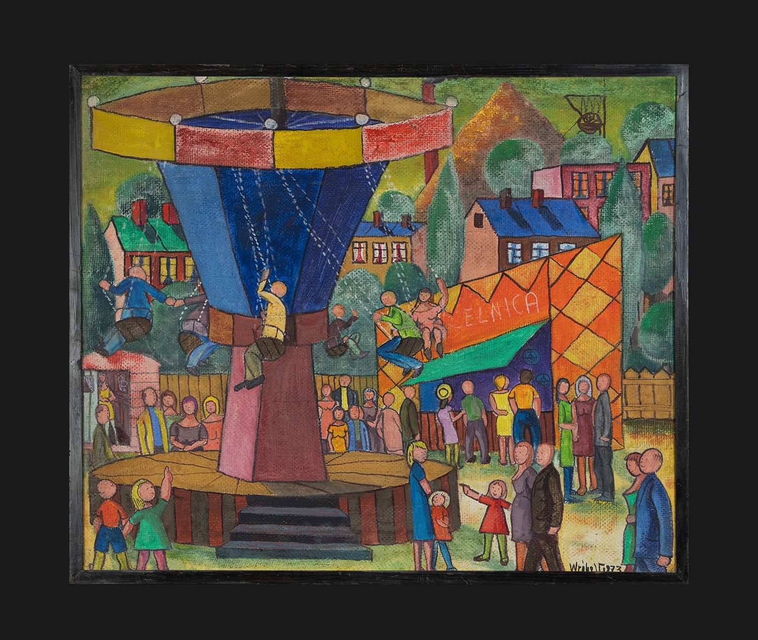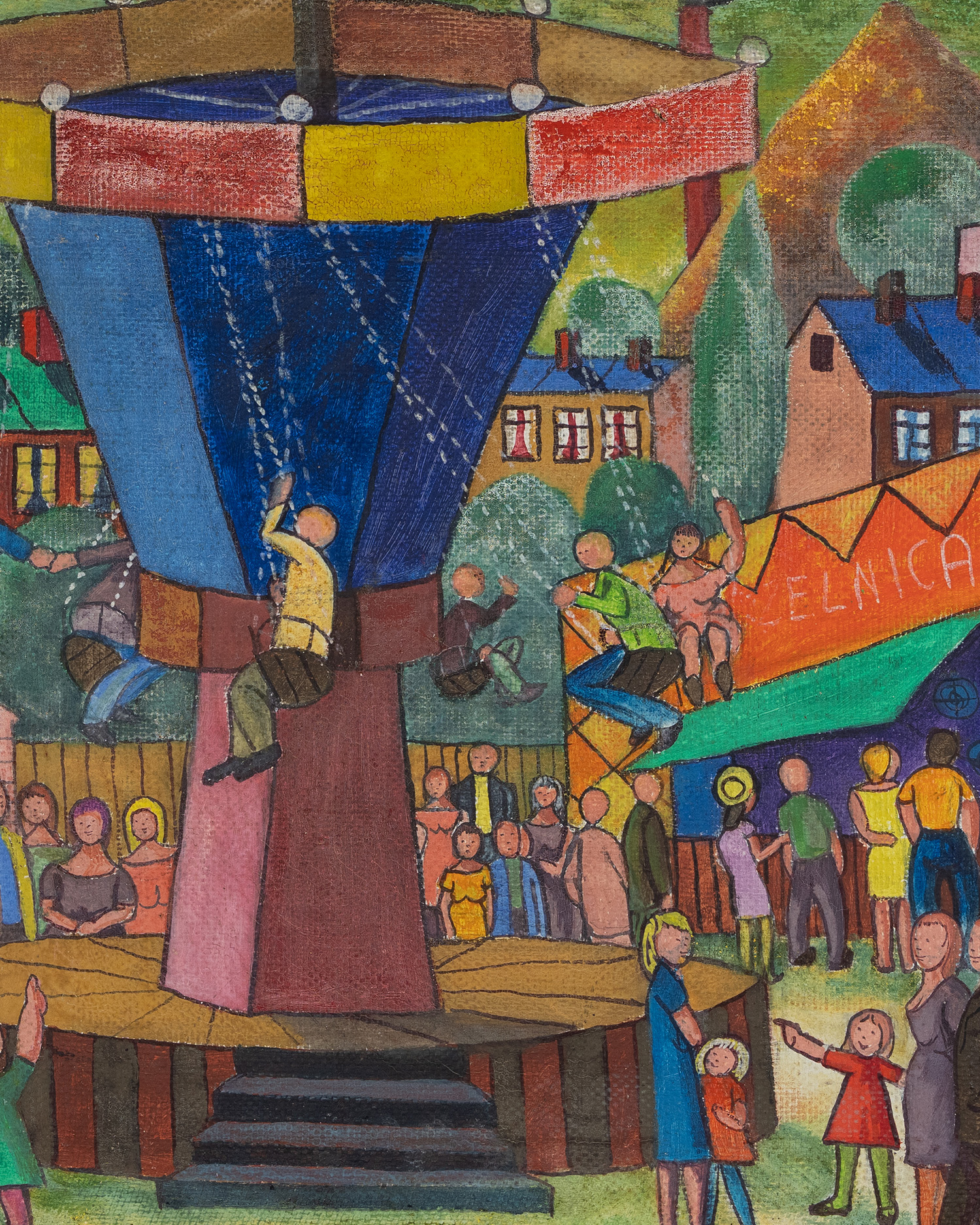 Wesołe miasteczko Pawła Wróbla ukazuje emocje wspólnotowe. Karuzela i tłum symbolizują dzieciństwo, zbiorowe przeżywanie radości oraz atmosferę święta w czasach PRL. Pojawiający się napis Strzelnica wprowadza dodatkowy kontekst rozrywki i lokalnego kolorytu. Praca nie tylko dekoruje, ale również dokumentuje społeczne przeżycia ludzi Śląska.