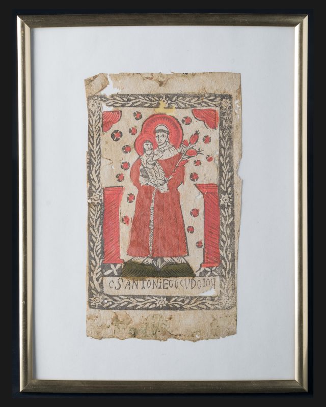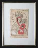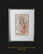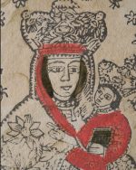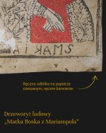 Oryginalny polski ludowy drzeworyt sakralny z końca XVIII lub początku XIX wieku, przedstawiający Matkę Boską z Dzieciątkiem, znany również jako Matka Boska z Mariampola. Postać Maryi w koronie, otoczona gwiazdami, trzymająca Dzieciątko Jezus ubrane w czerwony płaszcz, z książeczką w dłoni z inskrypcją u dołu “AIRAMS”. Kompozycja statyczna, uproszczona i symetryczna, typowa dla grafiki dewocyjnej rozpowszechnionej wśród ludu.