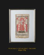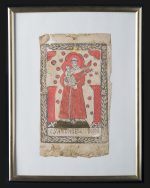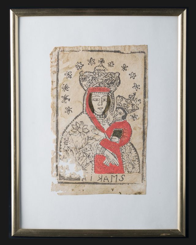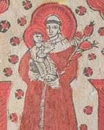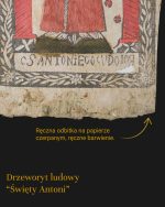 Oryginalny ludowy drzeworyt dewocyjny z końca XVIII lub początku XIX wieku, przedstawiający św. Antoniego Padewskiego z Dzieciątkiem Jezus. Postać ujęta frontalnie, z dużą czerwienią szaty, trzymająca Dzieciątko oraz kwiaty (lilie – symbol czystości). Ujęcie otoczone dekoracyjną ramką liściastą, z napisem u dołu “OSANTONIEGOCUDOIOR”. Oprawiony.