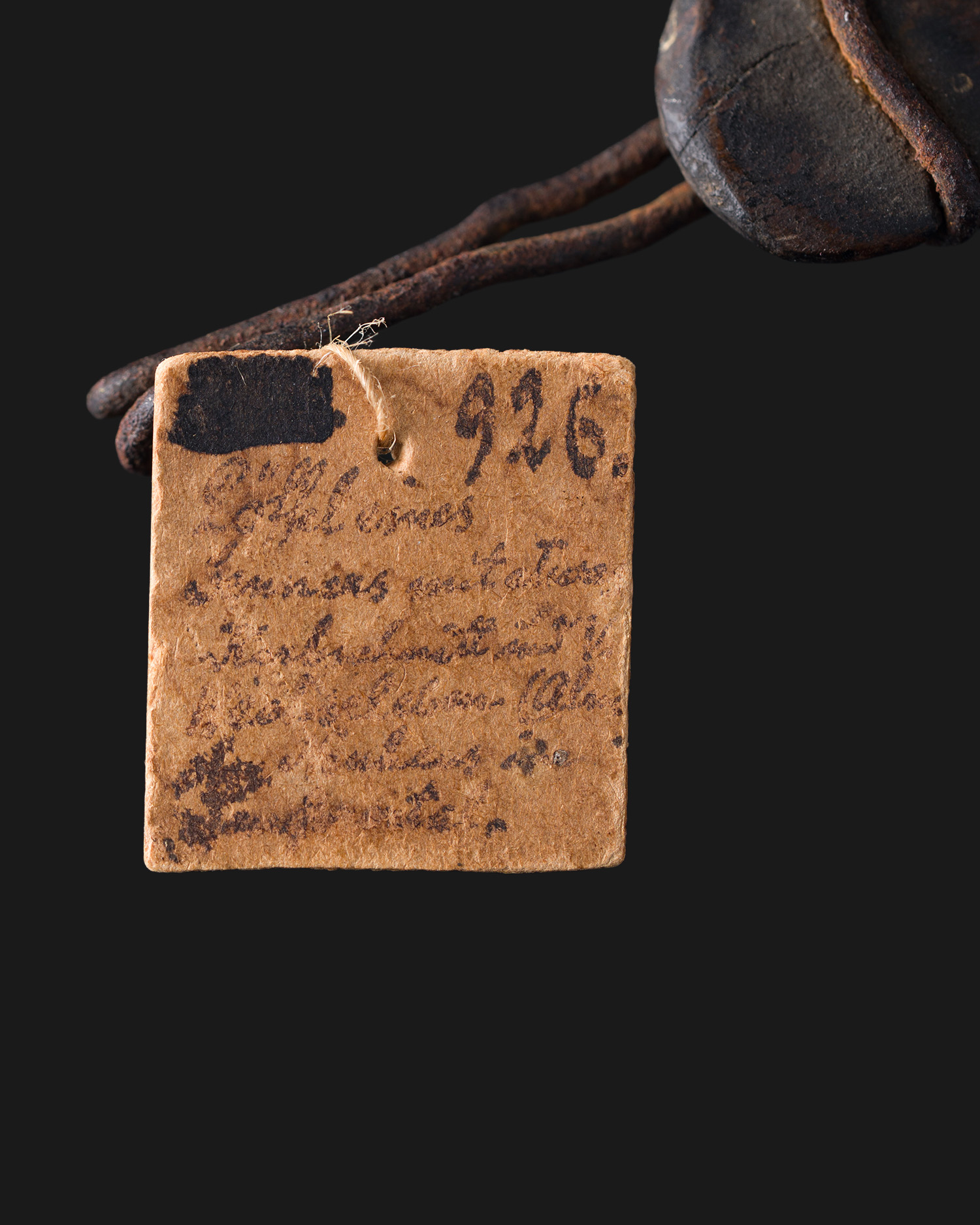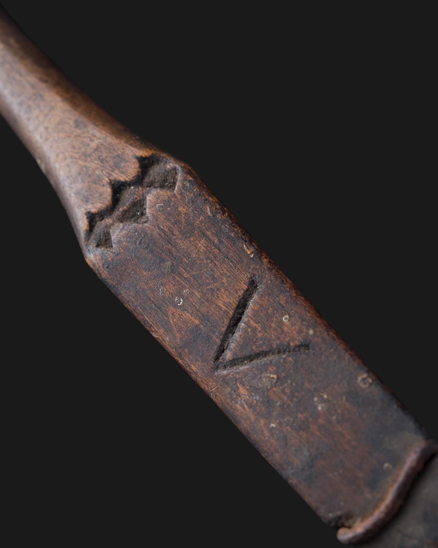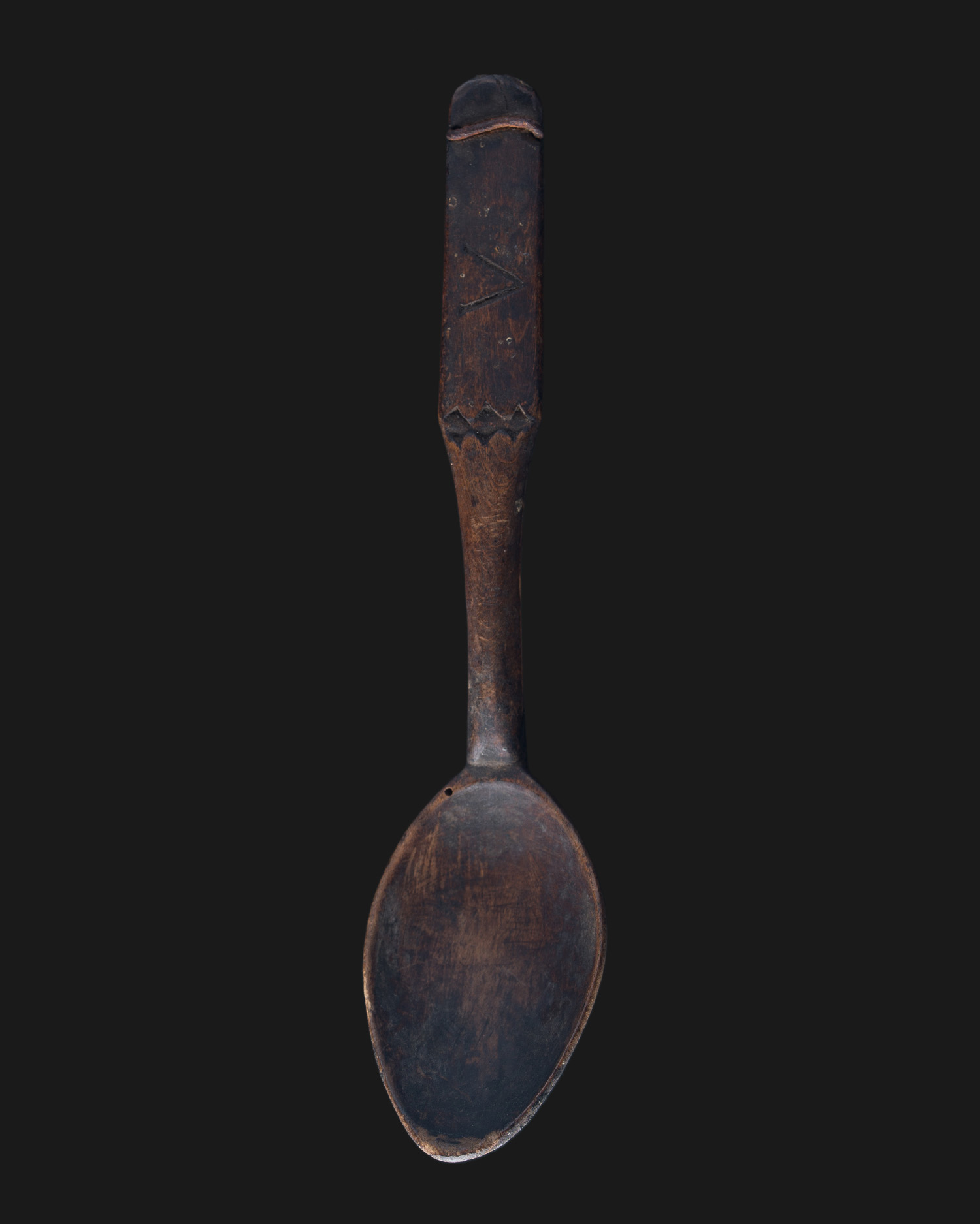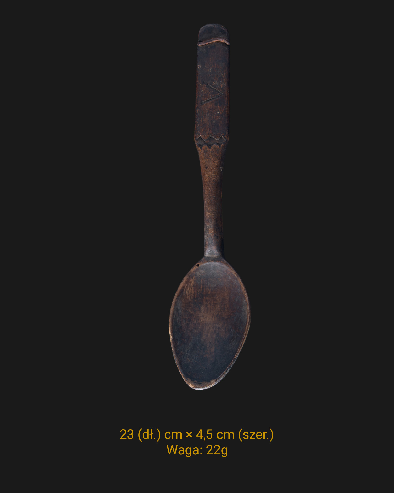 Ręcznie rzeźbiona łyżka drewniana o długości 23 cm, pochodząca z Polski, datowana na XIX wiek lub wcześniej. Czarka głęboka, wyraźnie użytkowa, ze śladami eksploatacji. Trzonek ozdobiony rytami w formie ząbkowanej linii oraz inicjałem „V”, pełniącym funkcję identyfikacji właściciela. Na końcu zachowany rzemień z przytwierdzoną starą papierową metką kolekcjonerską.