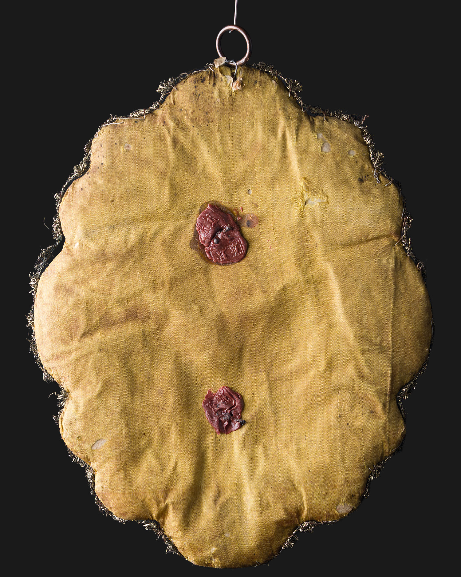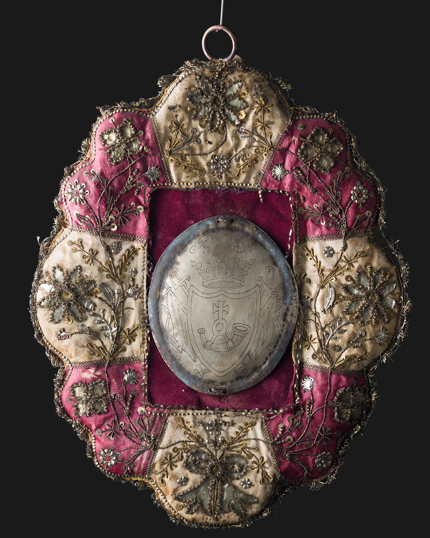 Plakieta herbowa z panopliami, srebro i jedwab, Polska, XVIII w.
