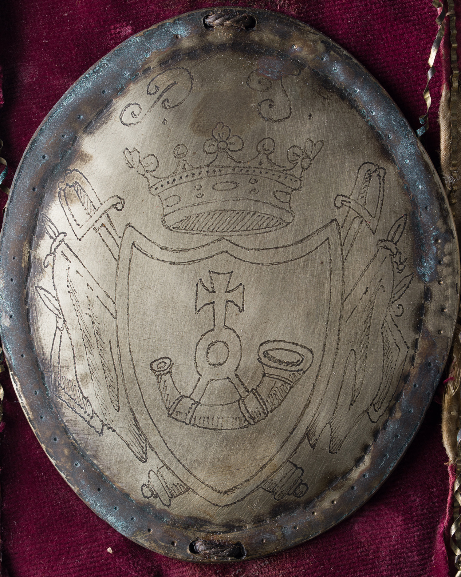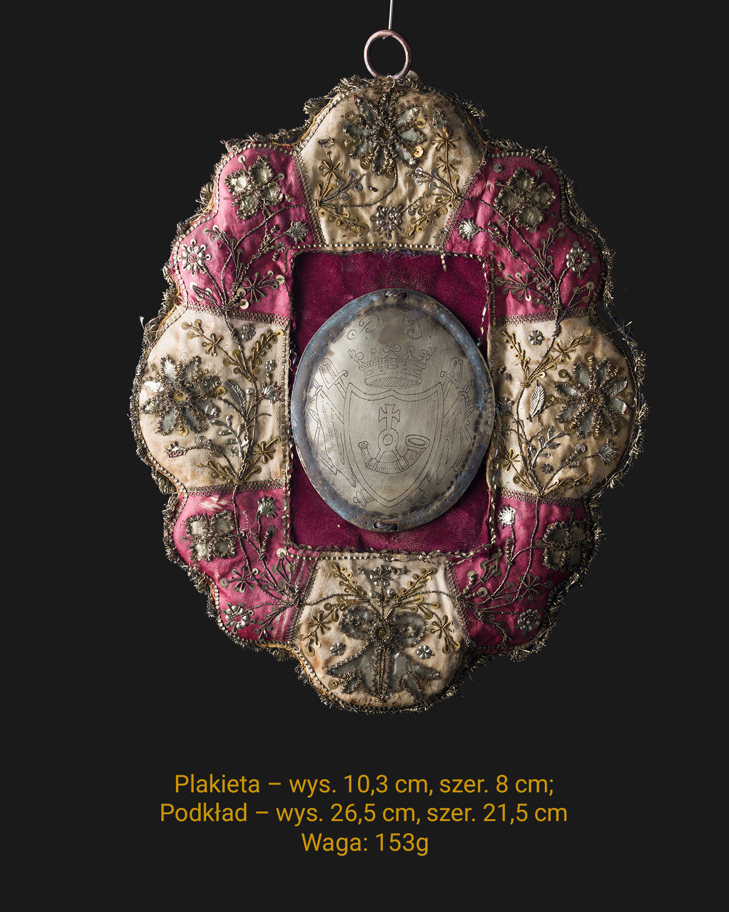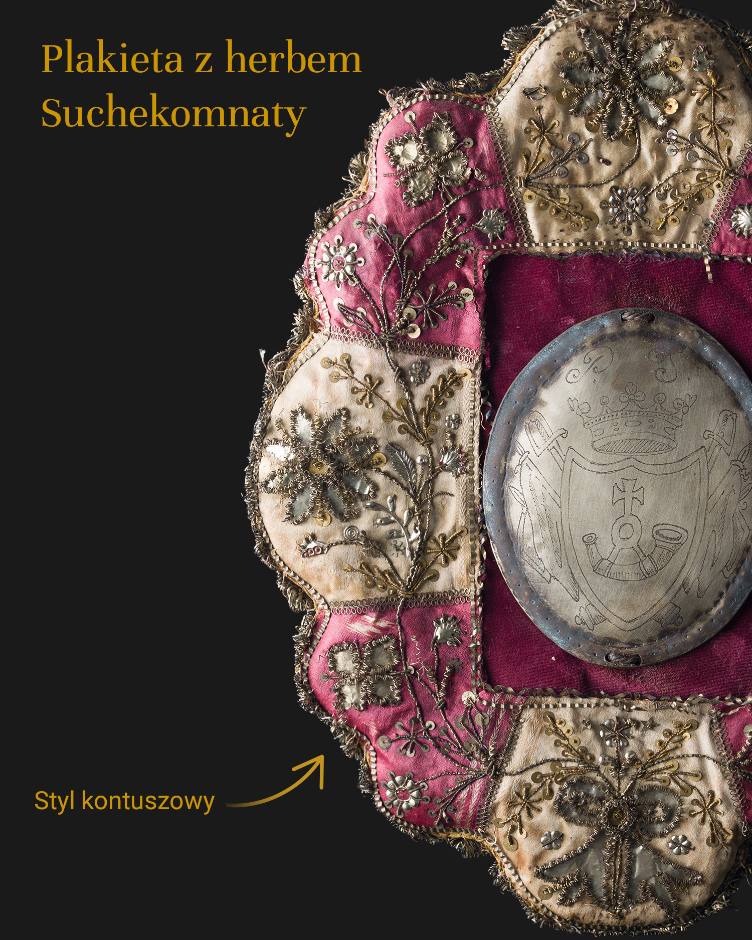 Unikatowa plakieta herbowo-wotywna, której centralnym elementem jest owalna srebrna plakieta pochodząca z końca XVIII wieku. Wygrawerowano na niej herb Suchekomnaty z motywami panoplii (uzbrojenia rycerskiego), labrów, hełmu i trąbki myśliwskiej, zwieńczony koroną szlachecką oraz monogramem „P.J.”. Plakieta została w latach 20.–30. XIX wieku przyszyta do ozdobnego, miękkiego podkładu tekstylnego wykonanego z naprzemiennych paneli tkanin jedwabnych w kolorze amarantowym i ecru. Tło ozdobiono ręcznym haftem wykonanym srebrnym bajorkiem, cekinami i blaszanymi aplikacjami tworzącymi kompozycje florystyczne. Na odwrocie zachowały się dwa oryginalne, czerwone stemple lakowe.