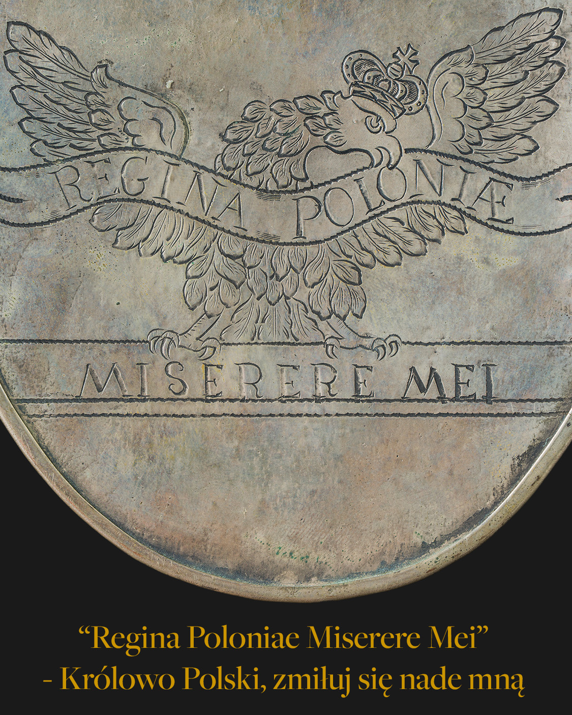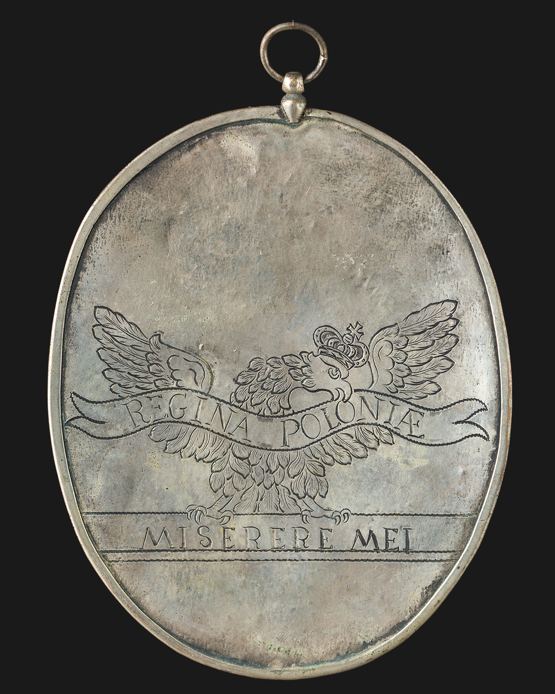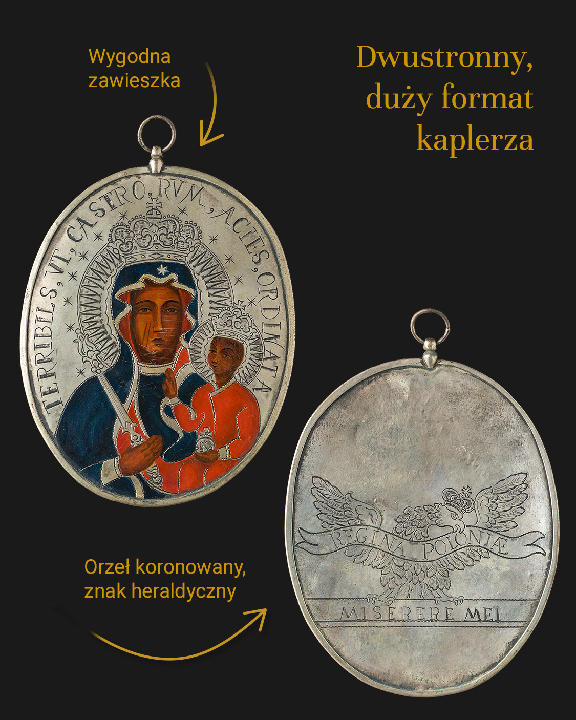 Na odwrocie umieszczono klasycznego orła z koroną, herbem i rozpostartymi skrzydłami, typowy dla ikonografii Królestwa Polskiego oraz wstęgę z napisem: “REGINA POLONIAE – MISERERE MEI” (Królowa Polski – zmiłuj się nade mną).Kaplerz wykonany z jednolitej, srebrzonej blachy (mosiądz lub alpaka), z uchwytem do zawieszenia. Wyrób o silnym ładunku symbolicznym, popularny zwłaszcza w okresach zaborów i narodowych pielgrzymek do Jasnej Góry.