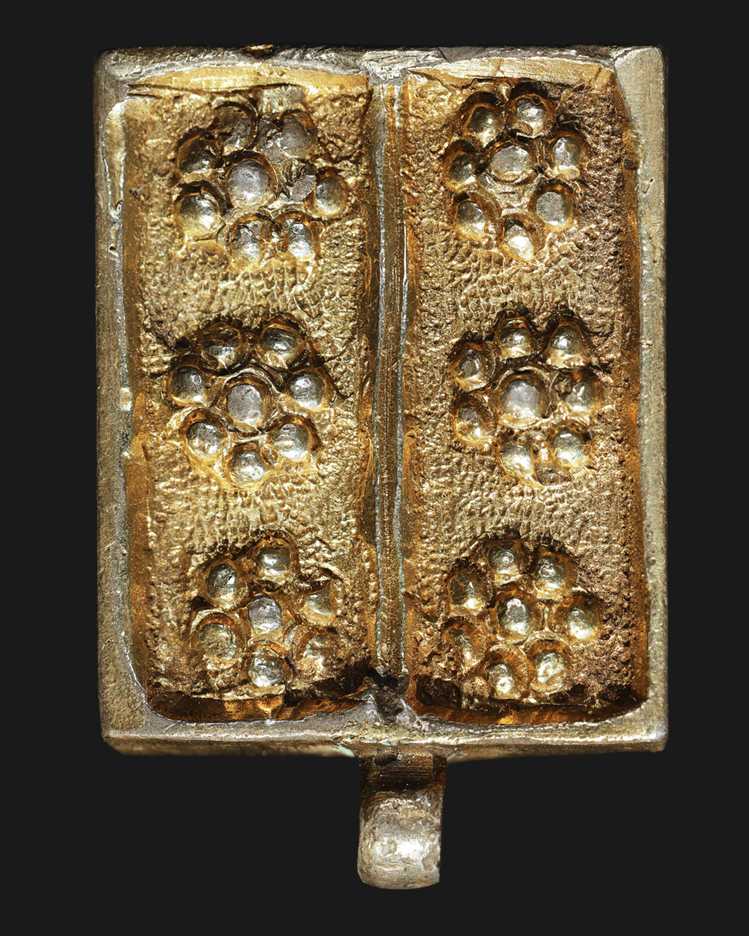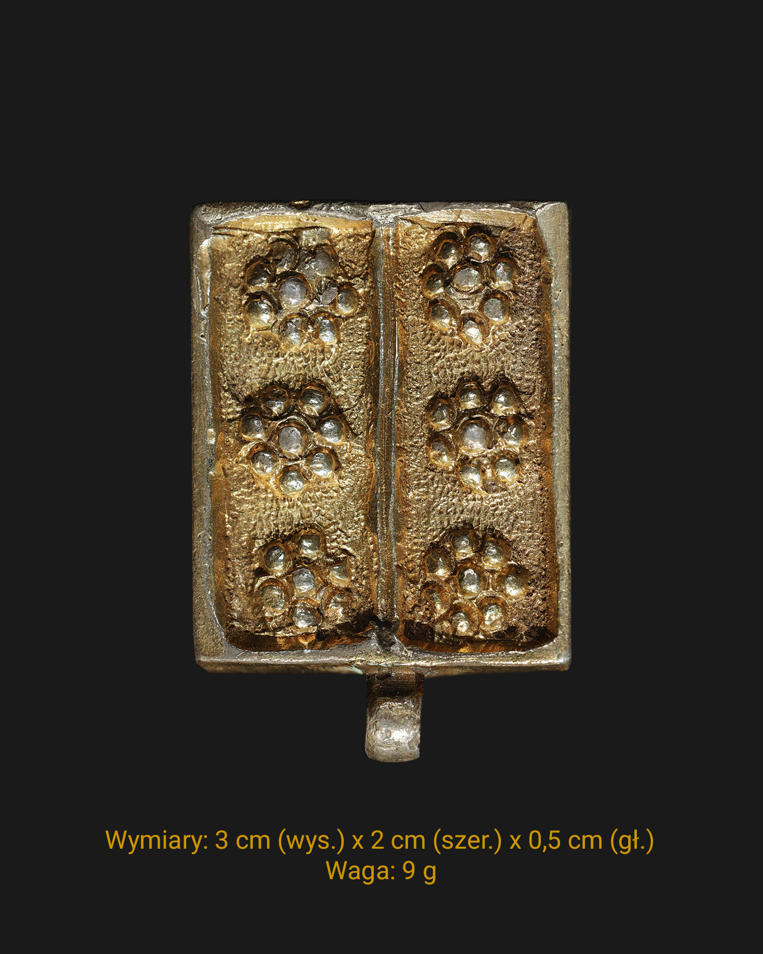 W dolnej części znajduje się uszko przeznaczone do zawieszenia elementu zdobniczego. Tego typu ogniwa tworzyły zapewne ciąg powtarzalnych segmentów pasa; uszka mogły występować jedynie przy niektórych z nich i służyć do podwieszenia ozdobnych dodatków, np. łańcuszków.