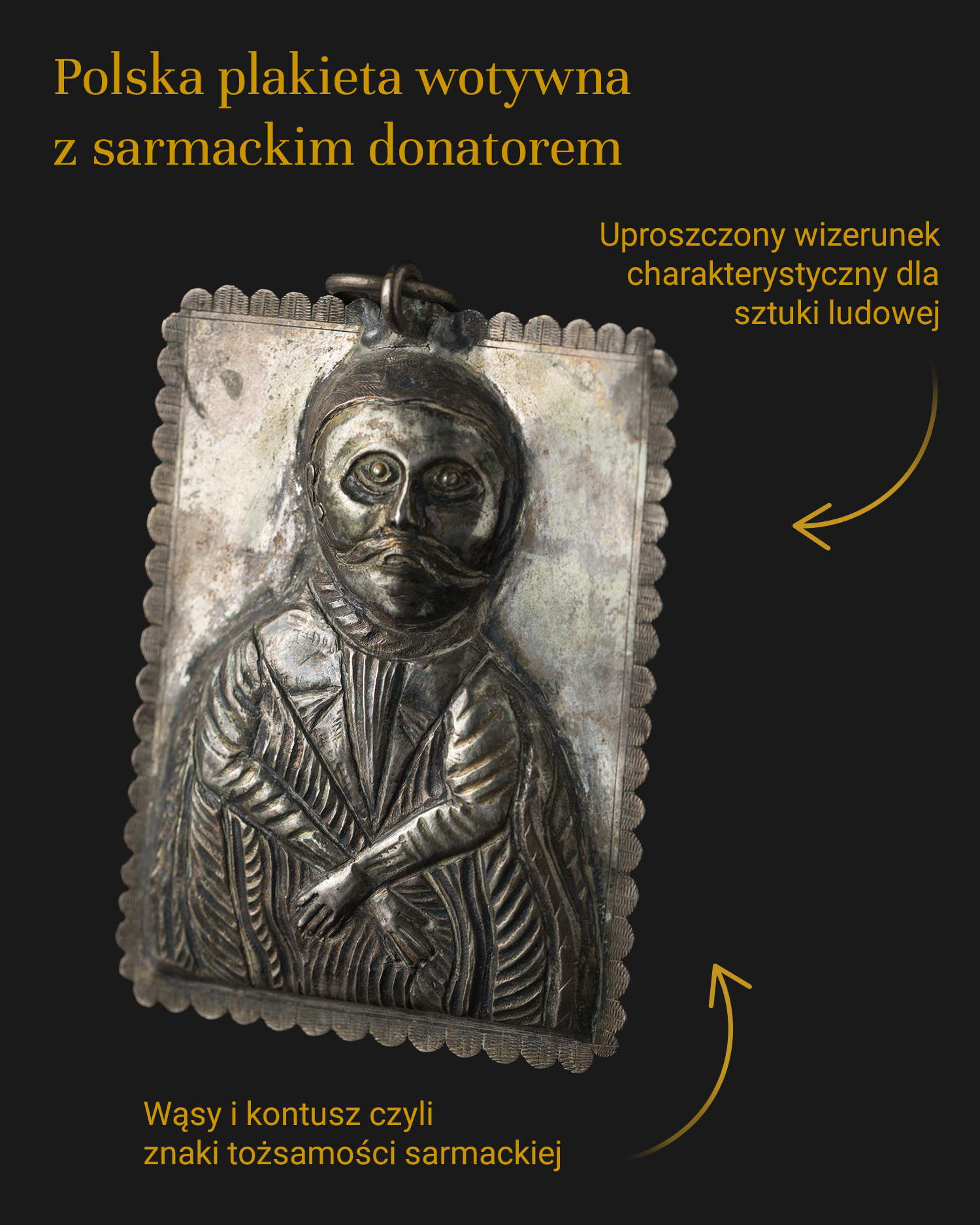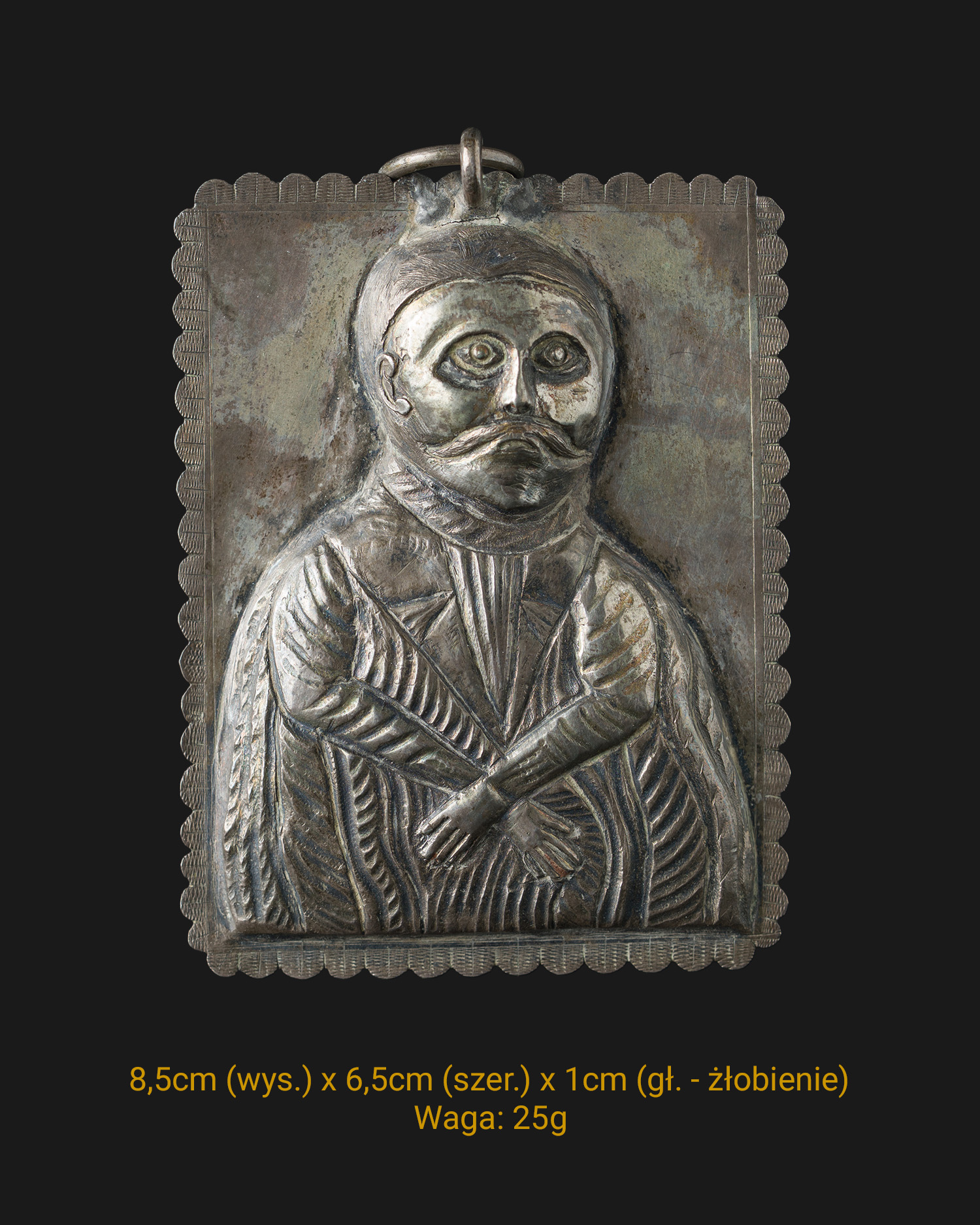 Plakieta wotywna wykonana w Polsce w XVII–XVIII wieku, przedstawiająca popiersie mężczyzny w stroju kontuszowym, z charakterystycznym wąsem i charakterystycznym dla sztuki ludowej groteskowym wyglądem. Forma prostokątna z dekoracyjnie wyciętym, karbowanym brzegiem. Relief wypukły od frontu, od tyłu wklęsły, wykonany techniką repusowania (repoussé). Do górnej krawędzi przylutowano wtórnie zawieszkę umożliwiającą pionową ekspozycję.