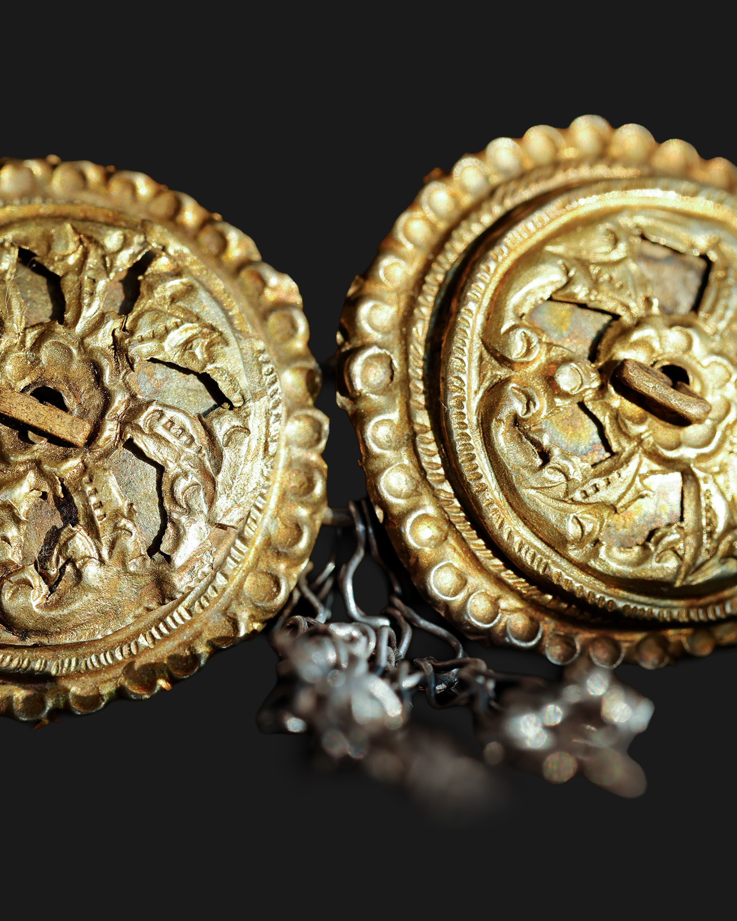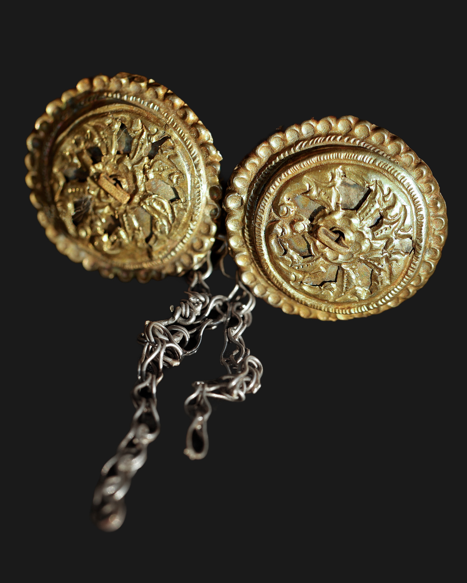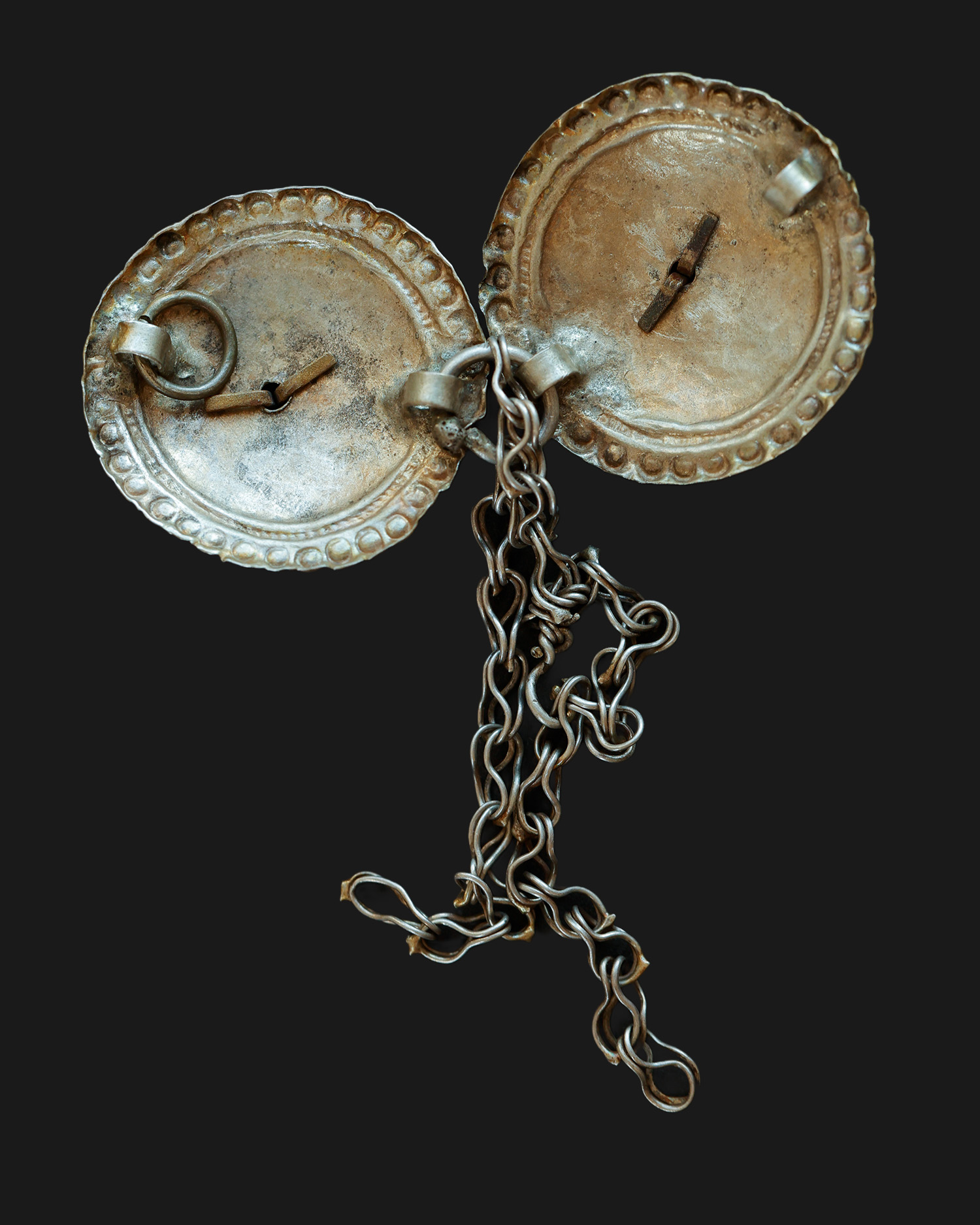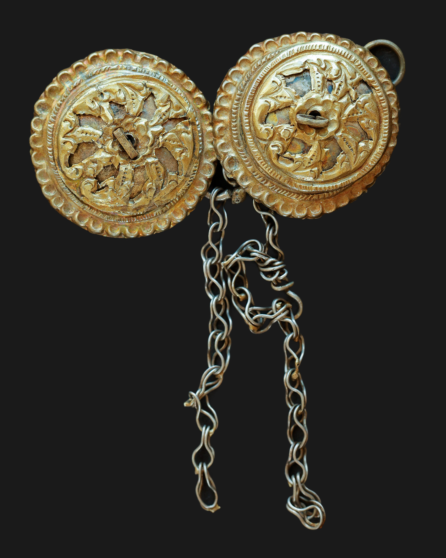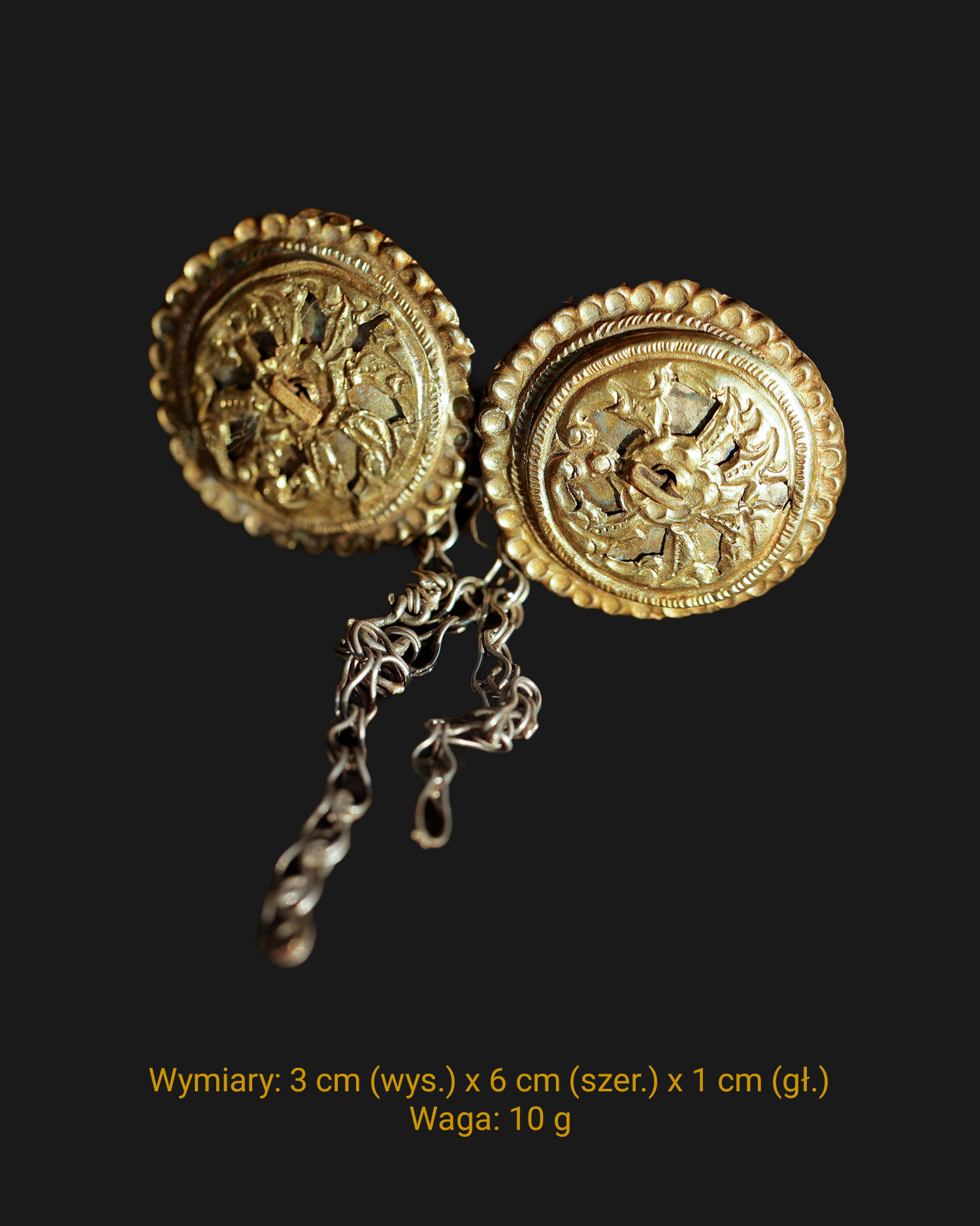 Ozdobna zapinka ze złoconego srebra, złożona z dwóch okrągłych tarczek połączonych kółkiem, do którego przymocowane są łańcuszki. Obecnie tarczki połączone są na stałe; możliwe, że jest to modyfikacja z epoki. Pierwotnie mogły być rozłączne, a łańcuszki pełniły funkcję ozdobną.