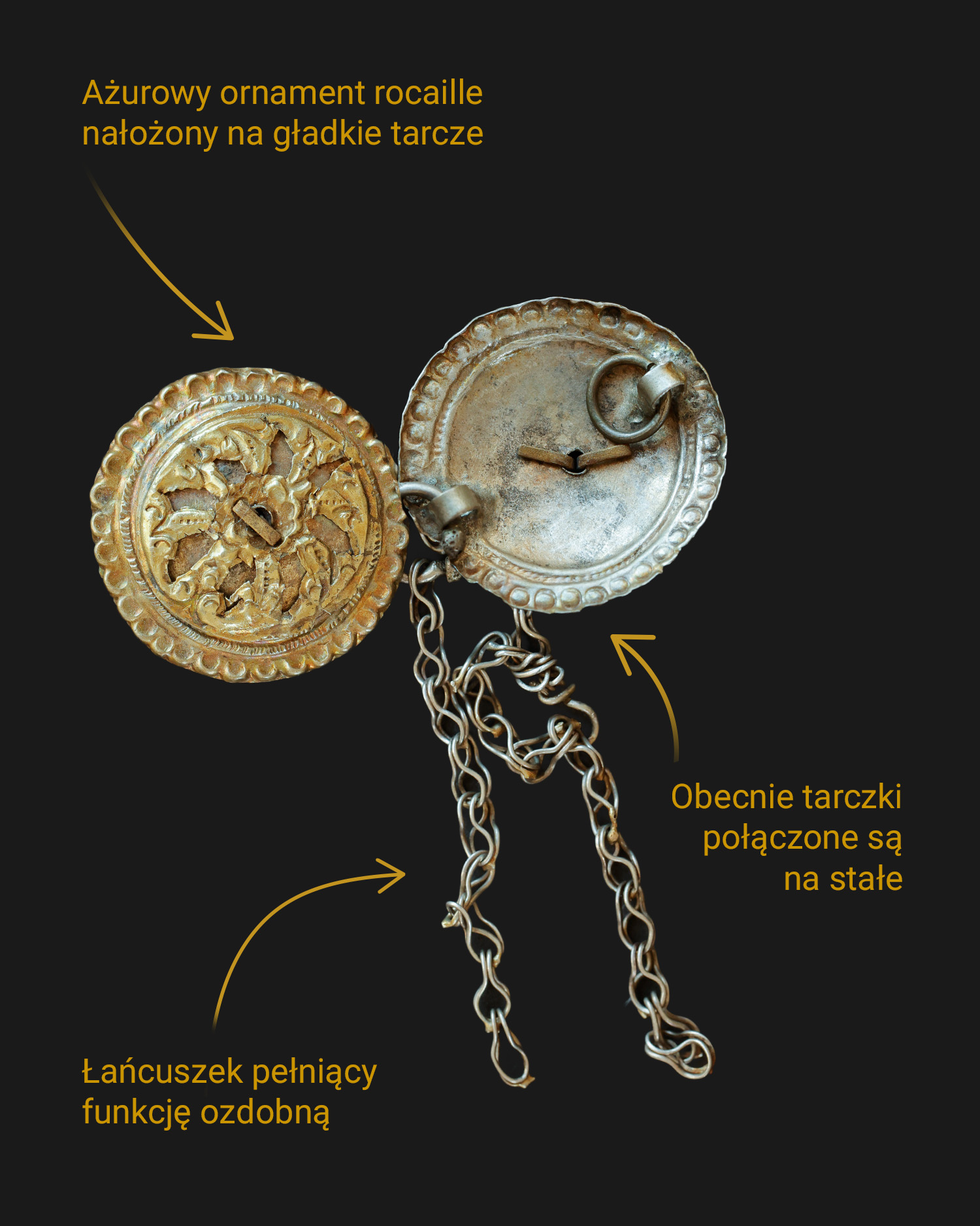 Każda tarczka składa się z gładkiego podkładu, przykrytego ażurową nakładką, zdobioną ornamentem rocaille oraz obwódką z drobnych kreseczek. Spodnia tarczka ma podobną obwódkę z kreseczek, a przy zewnętrznej krawędzi dodatkowo pas dekoracyjny w postaci wklęsłych kropeczek, tworzących dookolny ornament. Na środku każdej tarczki znajduje się zgniecione uszko, element ten pełni funkcję konstrukcyjną, łącząc ażurową nakładkę z podkładem.